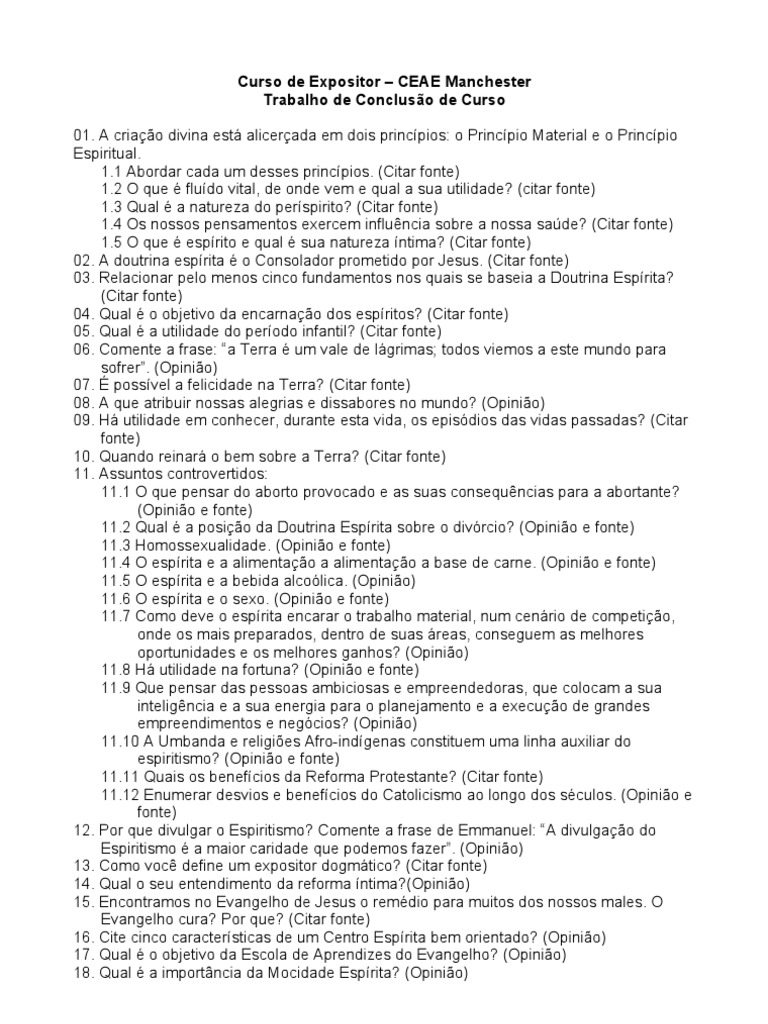 . A criao divina est alicerada em dois princpios: o Princpio Material e o Princpio Espiritual. 1.1 Abordar cada um desses princpios. (Citar fonte) 1.2 O que fludo vital, de onde vem e qual a sua utilidade? (citar fonte) 1.3 Qual a natureza do perspirito? (Citar fonte) 1.4 Os nossos pensamentos exercem influncia sobre a nossa sade? (Citar fonte) 1.5 O que esprito e qual sua natureza ntima? (Citar fonte) 02. A doutrina esprita o Consolador prometido por Jesus. (Citar fonte) 03. Relacionar pelo menos cinco fundamentos nos quais se baseia a Doutrina Esprita? (Citar fonte) 04. Qual o objetivo da encarnao dos espritos? (Citar fonte) 05. Qual a utilidade do perodo infantil? (Citar fonte) 06. Comente a frase: a Terra um vale de lgrimas; todos viemos a este mundo para sofrer. (Opinio) 07. possvel a felicidade na Terra? (Citar fonte) 08. A que atribuir nossas alegrias e dissabores no mundo? (Opinio) 09. H utilidade em conhecer, durante esta vida, os episdios das vidas passadas? (Citar fonte) 10. Quando reinar o bem sobre a Terra? (Citar fonte) 11. Assuntos controvertidos: 11.1 O que pensar do aborto provocado e as suas consequncias para a abortante? (Opinio e fonte) 11.2 Qual a posio da Doutrina Esprita sobre o divrcio? (Opinio e fonte) 11.3 Homossexualidade. (Opinio e fonte) 11.4 O esprita e a alimentao a alimentao a base de carne. (Opinio e fonte) 11.5 O esprita e a bebida alcolica. (Opinio) 11.6 O esprita e o sexo. (Opinio e fonte) 11.7 Como deve o esprita encarar o trabalho material, num cenrio de competio, onde os mais preparados, dentro de suas reas, conseguem as melhores oportunidades e os melhores ganhos? (Opinio) 11.8 H utilidade na fortuna? (Opinio e fonte) 11.9 Que pensar das pessoas ambiciosas e empreendedoras, que colocam a sua inteligncia e a sua energia para o planejamento e a execuo de grandes empreendimentos e negcios? (Opinio) 11.10 A Umbanda e religies Afro-indgenas constituem uma linha auxiliar do espiritismo? (Opinio e fonte) 11.11 Quais os benefcios da Reforma Protestante? (Citar fonte) 11.12 Enumerar desvios e benefcios do Catolicismo ao longo dos sculos. (Opinio e fonte) 12. Por que divulgar o Espiritismo? Comente a frase de Emmanuel: A divulgao do Espiritismo a maior caridade que podemos fazer. (Opinio) 13. Como voc define um expositor dogmtico? (Citar fonte) 14. Qual o seu entendimento da reforma ntima?(Opinio) 15. Encontramos no Evangelho de Jesus o remdio para muitos dos nossos males. O Evangelho cura? Por que? (Citar fonte) 16. Cite cinco caractersticas de um Centro Esprita bem orientado? (Opinio) 17. Qual o objetivo da Escola de Aprendizes do Evangelho? (Opinio) 18. Qual a importncia da Mocidade Esprita? (Opinio)