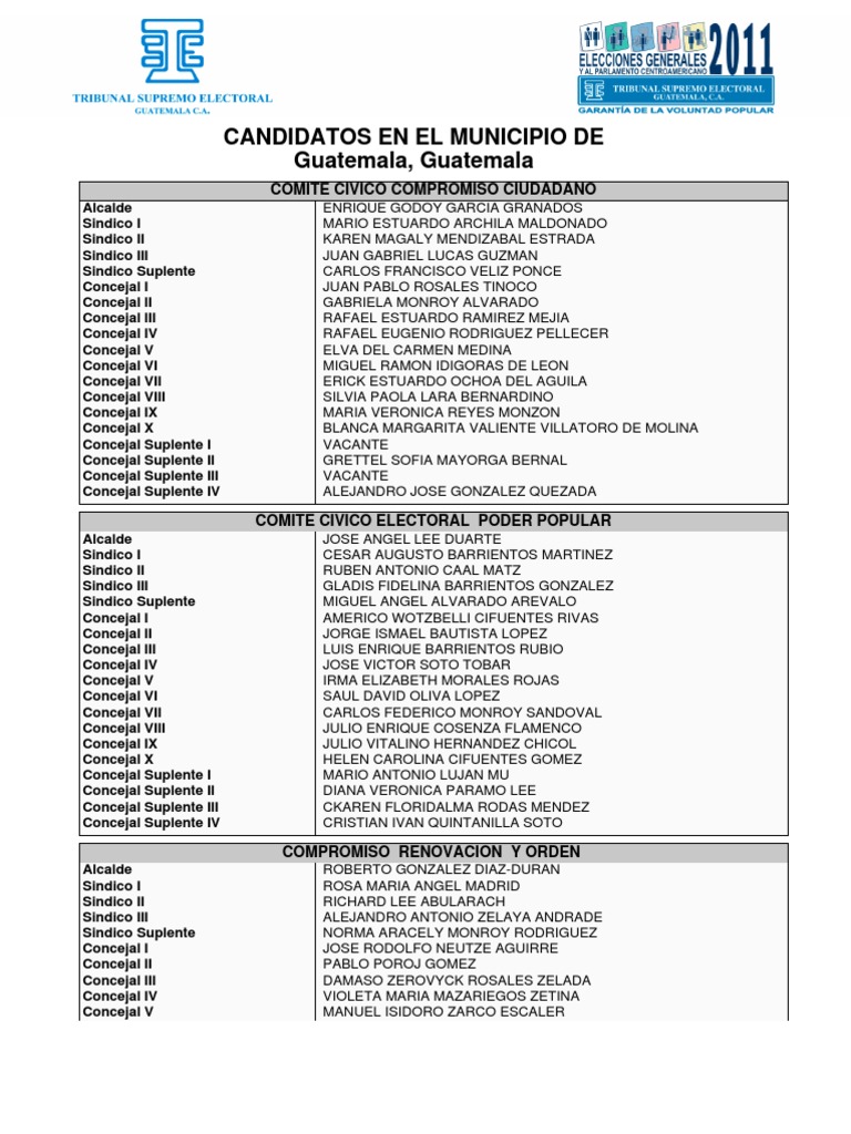 CANDIDATOS EN EL MUNICIPIO DE Guatemala, Guatemala