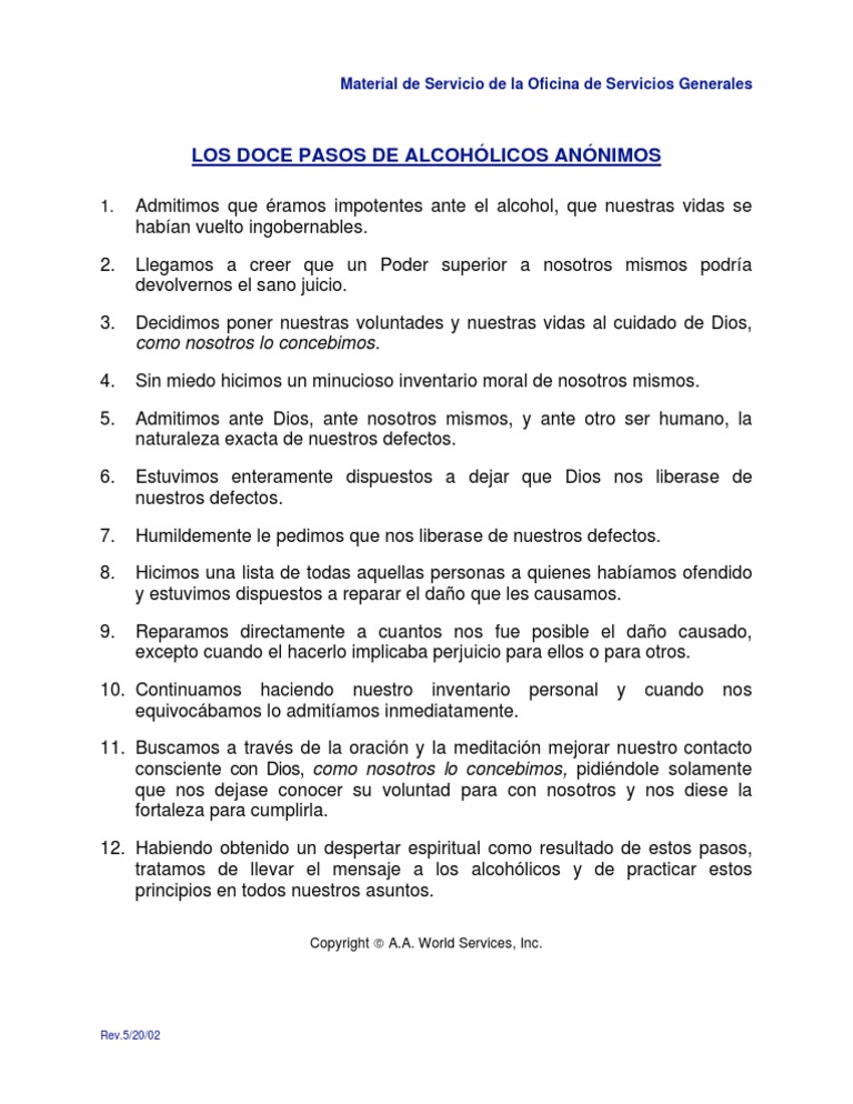 Admitimos que ramos impotentes ante el alcohol, que nuestras vidas se haban vuelto ingobernables. Llegamos a creer que un Poder superior a nosotros mismos podra devolvernos el sano juicio. Decidimos poner nuestras voluntades y nuestras vidas al cuidado de Dios, como nosotros lo concebimos. Sin miedo hicimos un minucioso inventario moral de nosotros mismos. Admitimos ante Dios, ante nosotros mismos, y ante otro ser humano, la naturaleza exacta de nuestros defectos. Estuvimos enteramente dispuestos a dejar que Dios nos liberase de nuestros defectos. Humildemente le pedimos que nos liberase de nuestros defectos. Hicimos una lista de todas aquellas personas a quienes habamos ofendido y estuvimos dispuestos a reparar el dao que les causamos. Reparamos directamente a cuantos nos fue posible el dao causado, excepto cuando el hacerlo implicaba perjuicio para ellos o para otros. y cuando nos