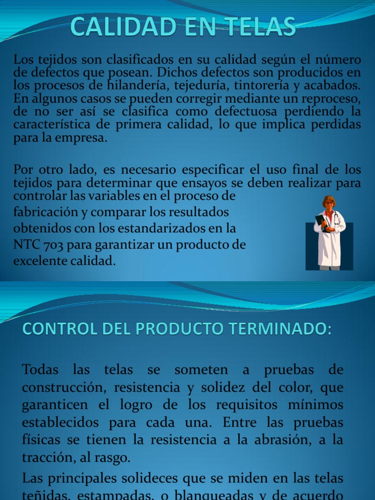 Por otro lado, es necesario especificar el uso final de los tejidos para determinar que ensayos se deben realizar para controlar las variables en el proceso de fabricacin y comparar los resultados obtenidos con los estandarizados en la NTC 703 para garantizar un producto de excelente calidad.