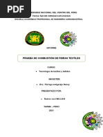Combustin (ignicin): Es el ms usado y prctico a nivel industrial, pero no el ms confiable cuando el material textil tiene ms de un tipo de fibra, pues con este mtodo se identifica la composicin qumica y por lo tanto el grupo genrico, es decir si es celulosa, proteinita o sinttico. Consiste en observar el comportamiento de la fibra antes, dentro y fuera de la llama, en su olor, llama, combustin y ceniza.