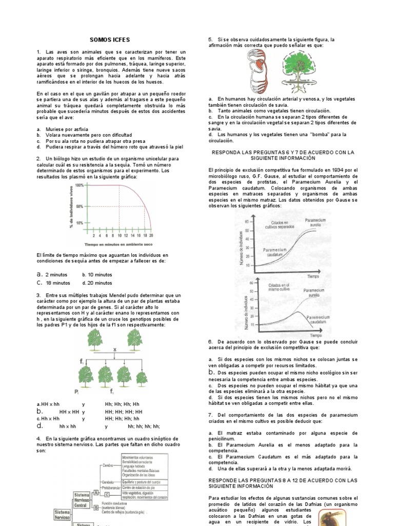 3. Entre sus mltiples trabajos Mendel pudo determinar que un carcter como por ejemplo la altura de un par de plantas estaba determinada por un par de genes. Si al carcter alto lo representamos con H y al carcter enano lo representamos con h , en la siguiente grfica de un cruce los genotipos posibles de los padres P1 y de los hijos de la f1 son respectivamente: 6. De acuerdo con lo observado por Gause se puede concluir acerca del principio de exclusin competitiva que: a. Si dos especies con los mismos nichos se colocan juntas se ven obligadas a competir por recursos limitados. b. Dos especies pueden ocupar el mismo nicho ecolgico sin ser necesaria la competencia entre ambas especies. c. Dos especies no pueden ocupar el mismo hbitat ya que una de las especies eliminar a la otra especie. d. Si dos especies tienen los mismos nichos pero no el mismo hbitat se ven obligadas a competir entre ellas. 7. Del comportamiento de las dos especies de paramecium criados en el mismo cultivo es posible deducir que: a. El matraz estaba contaminado por alguna especie de penicilinum. b. El Paramecium Aurelia es el menos adaptado para la competencia. c. El Paramecium Caudatum es el ms adaptado para la competencia. d. Una de ellas superar a la otra y la menos adaptada morir. RESPONDE LAS PREGUNTAS 8 A 12 DE ACUERDO CON LAS SIGUIENTE INFORMACIN Para estudiar los efectos de algunas sustancias comunes sobre el promedio de latidos del corazn de las Dafnias (un organismo acutico pequeo) algunos estudiantes colocaron a las Dafnias en unas gotas de agua en un recipiente de vidrio. Los estudiantes adicionaron luego de una o ms gotas en el agua del frasco y esperaron por 10 segundos. Ellos contaron los latidos del corazn por 10 segundos. Los estudiantes usaron un frasco limpio y una nueva Dafnia cada vez. La siguiente tabla de datos muestra los resultados del experimento.