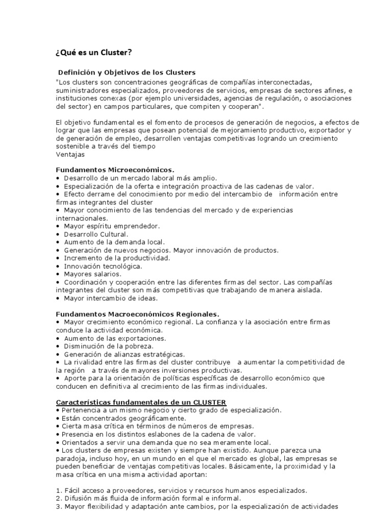 Definicin y Objetivos de los Clusters "Los clusters son concentraciones geogrficas de compaas interconectadas, suministradores especializados, proveedores de servicios, empresas de sectores afines, e instituciones conexas (por ejemplo universidades, agencias de regulacin, o asociaciones del sector) en campos particulares, que compiten y cooperan". El objetivo fundamental es el fomento de procesos de generacin de negocios, a efectos de lograr que las empresas que posean potencial de mejoramiento productivo, exportador y de generacin de empleo, desarrollen ventajas competitivas logrando un crecimiento sostenible a travs del tiempo Ventajas Fundamentos Microeconmicos. Desarrollo de un mercado laboral ms amplio. Especializacin de la oferta e integracin proactiva de las cadenas de valor. Efecto derrame del conocimiento por medio del intercambio de informacin entre firmas integrantes del cluster Mayor conocimiento de las tendencias del mercado y de experiencias internacionales. Mayor espritu emprendedor. Desarrollo Cultural. Aumento de la demanda local. Generacin de nuevos negocios. Mayor innovacin de productos. Incremento de la productividad. Innovacin tecnolgica. Mayores salarios. Coordinacin y cooperacin entre las diferentes firmas del sector. Las compaas integrantes del cluster son ms competitivas que trabajando de manera aislada. Mayor intercambio de ideas. Fundamentos Macroeconmicos Regionales. Mayor crecimiento econmico regional. La confianza y la asociacin entre firmas conduce la actividad econmica. Aumento de las exportaciones. Disminucin de la pobreza. Generacin de alianzas estratgicas. La rivalidad entre las firmas del cluster contribuye a aumentar la competitividad de la regin a travs de mayores inversiones productivas. Aporte para la orientacin de polticas especficas de desarrollo econmico que conducen en definitiva al crecimiento de las firmas individuales. Caractersticas fundamentales de un CLUSTER Pertenencia a un mismo negocio y cierto grado de especializacin. Estn concentrados geogrficamente. Cierta masa crtica en trminos de nmeros de empresas. Presencia en los distintos eslabones de la cadena de valor. Orientados a servir una demanda que no sea meramente local. Los clusters de empresas existen y siempre han existido. Aunque parezca una paradoja, incluso hoy, en un mundo en el que el mercado es global, las empresas se pueden beneficiar de ventajas competitivas locales. Bsicamente, la proximidad y la masa crtica en una misma actividad aportan: 1. Fcil acceso a proveedores, servicios y recursos humanos especializados. 2. Difusin ms fluida de informacin formal e informal. 3. Mayor flexibilidad y adaptacin ante cambios, por la especializacin de actividades
