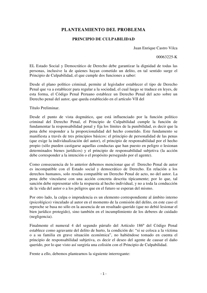 PRINCIPIO DE CULPABILIDAD Juan Enrique Castro Vilca 00063225-K EL Estado Social y Democrtico de Derecho debe garantizar la dignidad de todas las personas, inclusive la de quienes hayan cometido un delito, en tal sentido surge el Principio de Culpabilidad, el que cumple dos funciones a saber: Desde el plano poltico criminal, permite al legislador establecer el tipo de Derecho Penal que va a establecer para regular a la sociedad, el cual luego se traduce en leyes, de esta forma, el Cdigo Penal Peruano establece un Derecho Penal del acto sobre un Derecho penal del autor, que queda establecido en el artculo VII del Ttulo Preliminar. Desde el punto de vista dogmtico, que est influenciado por la funcin poltico criminal del Derecho Penal, el Principio de Culpabilidad cumple la funcin de fundamentar la responsabilidad penal y fija los lmites de la punibilidad, es decir que la pena debe responder a la proporcionalidad del hecho cometido. Este fundamento se manifiesta a travs de tres principios bsicos: el principio de personalidad de las penas (que exige la individualizacin del autor), el principio de responsabilidad por el hecho propio (slo pueden castigarse aquellas conductas que han puesto en peligro o lesionan determinados bienes jurdicos) y el principio de responsabilidad subjetiva (la accin debe corresponder a la intencin o el propsito perseguido por el agente). Como consecuencia de lo anterior debemos mencionar que el Derecho Penal de autor es incompatible con el Estado social y democrtico de Derecho. En relacin a los derechos humanos, solo resulta compatible un Derecho Penal de acto, no del autor. La pena debe vincularse con una accin concreta descrita tpicamente; por lo que, tal sancin debe representar slo la respuesta al hecho individual, y no a toda la conduccin de la vida del autor o a los peligros que en el futuro se esperan del mismo. Por otro lado, la culpa o imprudencia es un elemento correspondiente al mbito interno (psicolgico) vinculado al autor en el momento de la comisin del delito, en este caso el reproche se basa no slo en la ausencia de un resultado querido (que no debi lesionar el bien jurdico protegido), sino tambin en el incumplimiento de los deberes de cuidado (negligencia). Finalmente el numeral 4 del segundo prrafo del Artculo 186 del Cdigo Penal establece como agravante del delito de hurto, la condicin de: si se coloca a la vctima o a su familia en grave situacin econmica, no habindose tomado en cuenta el principio de responsabilidad subjetiva, es decir el deseo del agente de causar el dao querido, por lo que visto as surgira una colisin con el Principio de Culpabilidad. Frente a ello, debemos plantearnos la siguiente interrogante: