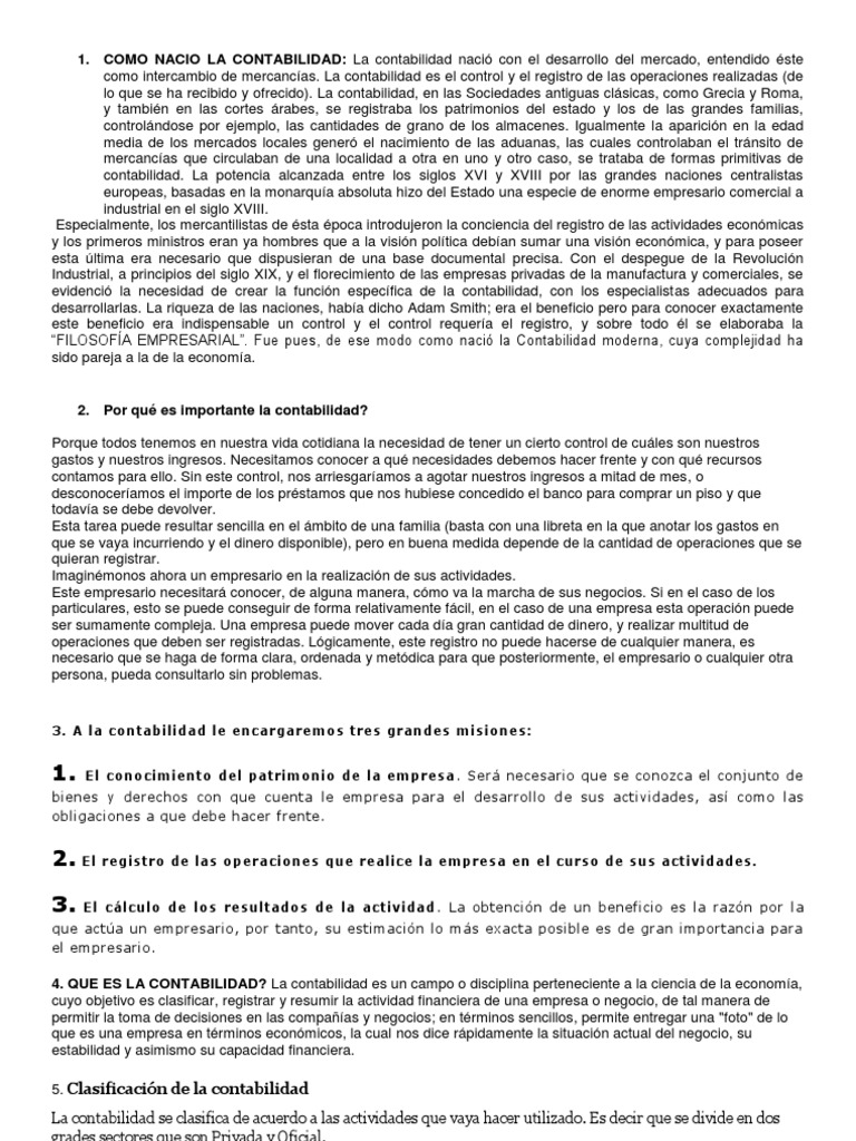 empresa tampoco podr deducir dicho gasto en el ejercicio 2010, toda vez que el gasto era conocido previa y oportunamente por la empresa usuaria y adems habr de tomar en cuenta que la fecha de emisin del comprobante de pago ha sido emitido con fecha enero del ejercicio 2010 y no por el mes de diciembre del ejercicio 2009, al que en rigor corresponde. Podemos advertir lo contraproducente, fiscalmente hablando, que resulta ser para una empresa que sta reciba un comprobante de pago en el cual se consigne una fecha de emisin que, en rigor, no se ajuste a la oportunidad prevista por la normativa especfica (RCP) y que por ende no permita la sustentacin del gasto respectivo, situacin que exige a las empresas redoblar sus esfuerzos de solicitar a los proveedores la emisin de los comprobantes de pago de acuerdo a la normatividad vigente (RCP) y al final de cuentas estar supeditados a la decisin que tome el aludido proveedor. Objetividad Los cambios en el activo, pasivo y en la expresin contable del patrimonio neto, se deben conocer formalmente en los registros contables, tan pronto como sea posible medirlos objetivamente y expresar dicha medida en trminos monetarios. Las modificaciones en el inventario se deben registrar tal cual es la operacin en los libros de contabilidad, para medirlos objetivamente en trminos monetarios y as no hacer distorsiones en la realidad de los registros contables. Prudencia Ante la circunstancia de tener que elegir entre dos valores, el contador debe optar por el ms bajo, minimizando de esta manera la participacin del propietario en las operaciones contables. Este principio general se puede expresar diciendo: Contabilizar todas las prdidas cuando se conocen, y las ganancias solamente cuando se hayan percibido. Una mala interpretacin de este principio puede llevar a una exageracin y por ende a una mala aplicacin del principio contable, resultando una incorrecta presentacin de la situacin financiera en el resultado de las operaciones contables, hasta incluso llegar a modificar el concepto contable del valor. Este principio es tambin llamado criterio conservador. Ante el hecho que el contador se encuentre entre dos o ms caminos razonables a seguir, deber optar por el que muestre la menor cifra de dos valores de activos relativos a un partida determinada; o ante el caso de registrar una operacin ste la har de modo que la participacin del propietario sea la menor posible. Ignorar las utilidades no realizadas y considerar eventuales prdidas. Es permitido el registro de estimaciones de perdidas mas no de ganancias, es decir, no anticipar lo que no tengo. Uniformidad Tanto los principios generales como las normas particulares principios de valuacin que se utilizan para la formulacin de los estados financieros deben ser aplicados uniformemente de un periodo a otro. Esto permitir una mejor comparacin de los estados financieros en los diversos periodos de una empresa en marcha. En caso de cualquier cambio relevante en la aplicacin de los principios generales y normas particulares, que afecte la presentacin de los estados financieros, se debe sealar por medio de una nota aclaratoria. Este principio seala que las empresas, al hacer uso de un mtodo para la presentacin de los estados financieros, debern ser consecuentes con el mismo, logrando uniformidad en la presentacin de la informacin expuesta en los registros contables de un periodo a otro. Si una empresa realiza cambios constantes en el mtodo que utiliza en cada periodo corto, dificultar la interpretacin y comparacin de los estados financieros; as como tambin, mostrar variaciones notables en los resultados presentados. Tambin se debe registrar las perdidas cuando se conocen. ejemplo: mercaderas rotas que no se pueden vender. Significacin o Importancia Relativa En la aplicacin de los principios contables y normas particulares se debe actuar necesariamente con sentido prctico. Esto quiere decir, que ante el hecho que se den situaciones de mnima importancia, stas se dejarn pasar por alto. No existe un acuerdo que determine la lnea exacta de separacin entre los hechos que son importantes y los que no lo son, dejando de esta manera la decisin al juicio y sentido comn del profesional contable. El contador deber pasar por alto situaciones que no revistan demasiada importancia, aplicando el mejor criterio de acuerdo a las circunstancias teniendo en cuenta diversos factores, como el efecto relativo en el activo, pasivo, patrimonio o en el resultado de las operaciones. Revelacin suficiente La informacin contable en los estados financieros debe ser clara y debe estar expuesta en forma clara. La informacin contable debe ser clara y comprensible para juzgar e interpretar los resultados de operacin y la situacin de la empresa. La informacin financiera debe ser la correcta y exacta. 18. QUE ES UNA EMPRESA: Para la Real Academia de la Lengua, una empresa es, una Unidad de organizacin dedicada a actividades industriales, mercantiles o de prestacin de servicios con fines lucrativos. Tambin podemos tomar como empresa, una tarea difcil de realizar. Pero este no es el caso. Nosotros tomaremos la idea de una organizacin productiva. Ya que una empresa, que se entiende como tal, tiene como finalidad ltima, el producir bienes. Los cuales son ofertados, en el mercado. Entindase como mercado, el concepto intangible, de tiendas o vitrinas, donde una persona, movida por una necesidad, va y compra aquel bien. Pero toda empresa requiere de un capital inicial. En aquellas con fines de lucro, lo colocan los socios. Ya sea de manera directa o por medio de la compra de acciones, en las sociedades annimas.