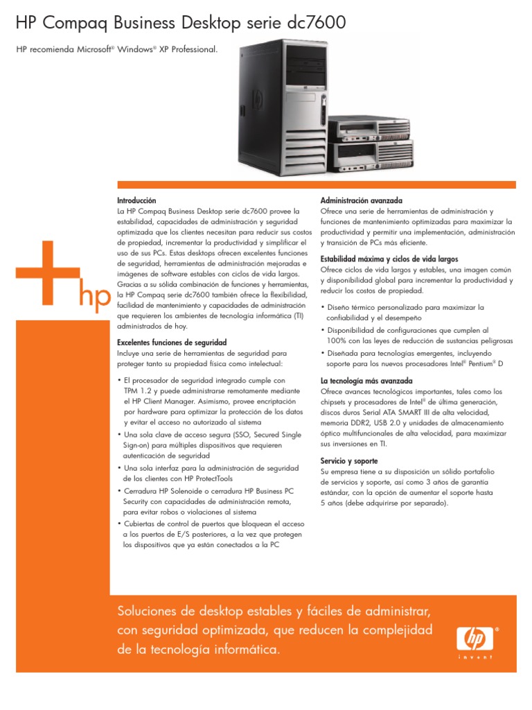 Introduccin La HP Compaq Business Desktop serie dc7600 provee la estabilidad, capacidades de administracin y seguridad optimizada que los clientes necesitan para reducir sus costos de propiedad, incrementar la productividad y simplificar el uso de sus PCs. Estas desktops ofrecen excelentes funciones de seguridad, herramientas de administracin mejoradas e imgenes de software estables con ciclos de vida largos. Gracias a su slida combinacin de funciones y herramientas, la HP Compaq serie dc7600 tambin ofrece la flexibilidad, facilidad de mantenimiento y capacidades de administracin que requieren los ambientes de tecnologa informtica (TI) administrados de hoy. Excelentes funciones de seguridad Incluye una serie de herramientas de seguridad para proteger tanto su propiedad fsica como intelectual: El procesador de seguridad integrado cumple con TPM 1.2 y puede administrarse remotamente mediante el HP Client Manager. Asimismo, provee encriptacin por hardware para optimizar la proteccin de los datos y evitar el acceso no autorizado al sistema Una sola clave de acceso segura (SSO, Secured Single Sign-on) para mltiples dispositivos que requieren autenticacin de seguridad Una sola interfaz para la administracin de seguridad de los clientes con HP ProtectTools Cerradura HP Solenoide o cerradura HP Business PC Security con capacidades de administracin remota, para evitar robos o violaciones al sistema Cubiertas de control de puertos que bloquean el acceso a los puertos de E/S posteriores, a la vez que protegen los dispositivos que ya estn conectados a la PC
