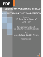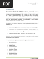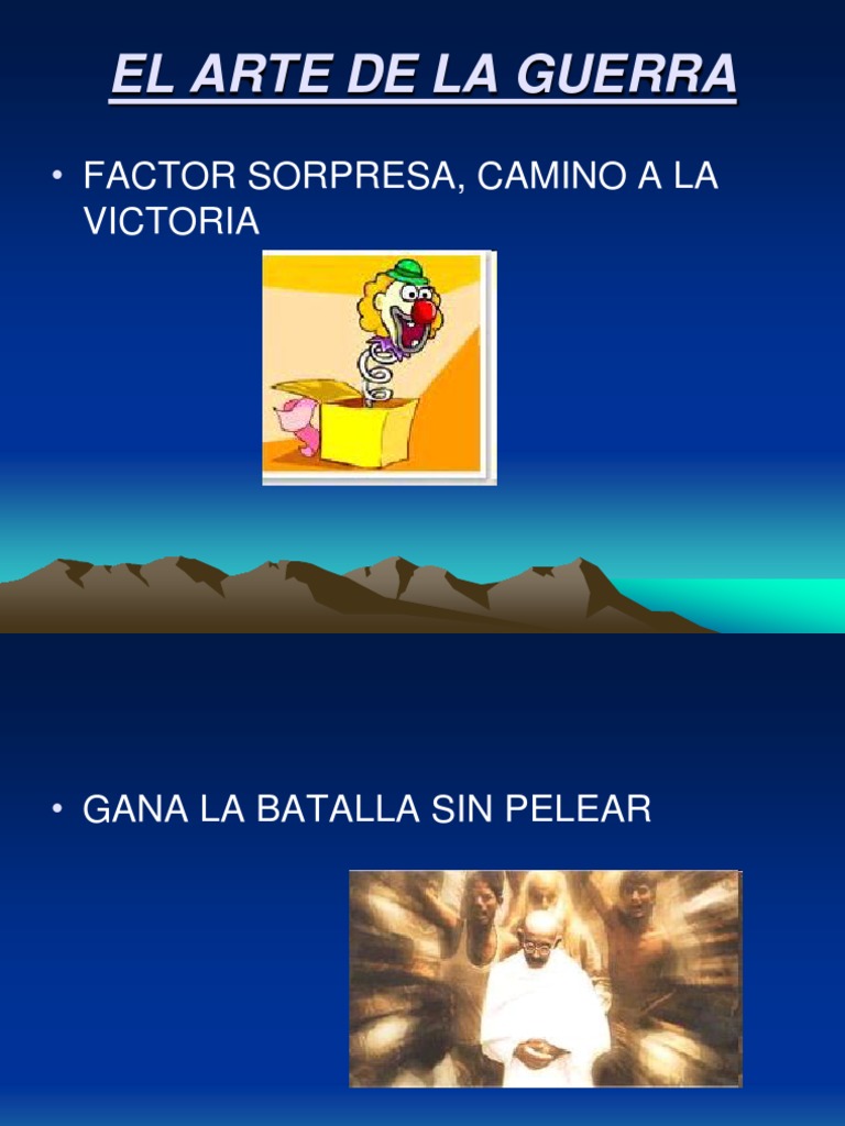 El documento ofrece consejos sobre la guerra, enfatizando la importancia del factor sorpresa, ganar batallas sin pelear directamente, y conocer bien al rival y a uno mismo para lograr grandes motivaciones y acciones.
