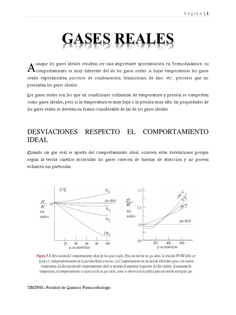 unque los gases ideales resultan ser una importante aproximacin en Termodinmica, su comportamiento es muy diferente del de los gases reales. A bajas temperaturas los gases reales experimentan procesos de condensacin, transiciones de fase, etc., procesos que no presentan los gases ideales. Los gases reales son los que en condiciones ordinarias de temperatura y presin se comportan como gases ideales; pero si la temperatura es muy baja o la presin muy alta, las propiedades de los gases reales se desvan en forma considerable de las de los gases ideales.