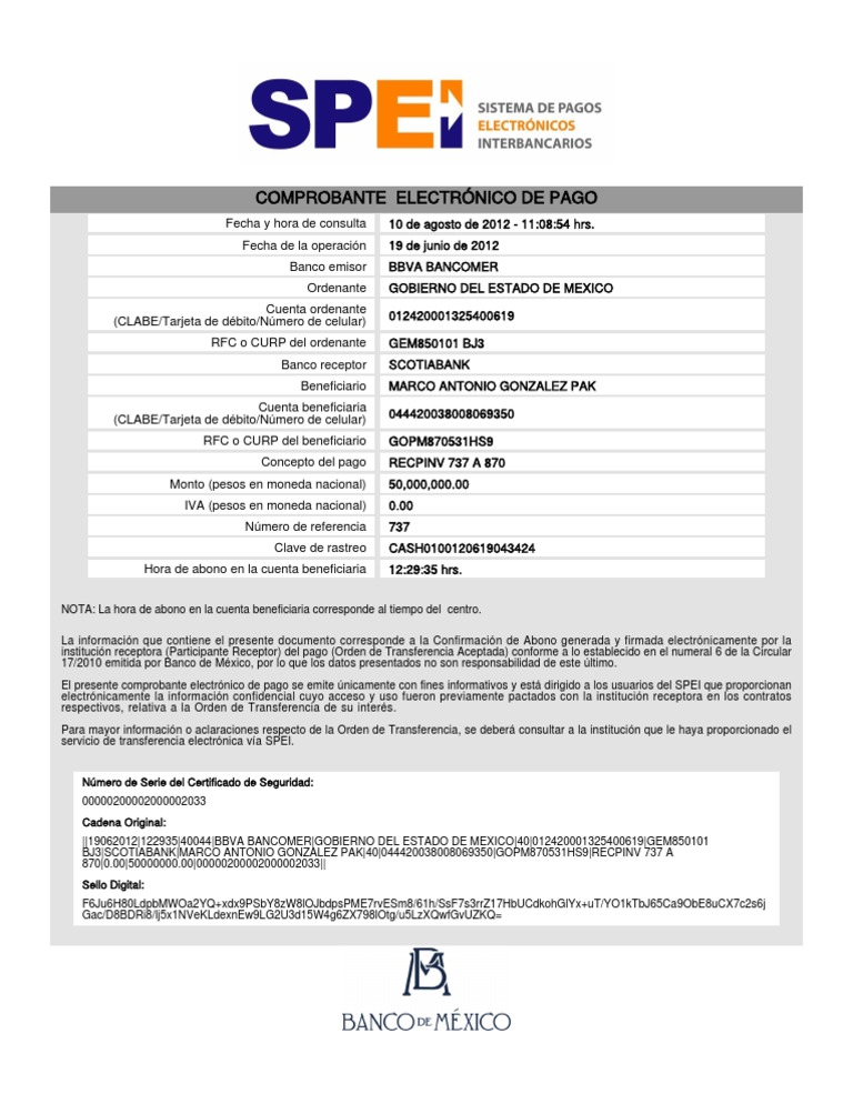 Fecha y hora de consulta Fecha de la operacin Banco emisor Ordenante Cuenta ordenante (CLABE/Tarjeta de dbito/Nmero de celular) RFC o CURP del ordenante Banco receptor Beneficiario Cuenta beneficiaria (CLABE/Tarjeta de dbito/Nmero de celular) RFC o CURP del beneficiario Concepto del pago Monto (pesos en moneda nacional) IVA (pesos en moneda nacional) Nmero de referencia Clave de rastreo Hora de abono en la cuenta beneficiaria 10 de agosto de 2012 - 11:08:54 hrs. 19 de junio de 2012 BBVA BANCOMER GOBIERNO DEL ESTADO DE MEXICO 012420001325400619 GEM850101 BJ3 SCOTIABANK MARCO ANTONIO GONZALEZ PAK 044420038008069350 GOPM870531HS9 RECPINV 737 A 870 50,000,000.00 0.00 737 CASH0100120619043424 12:29:35 hrs.