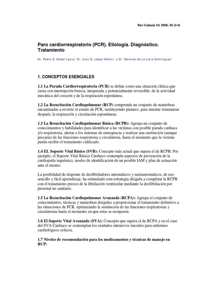 1. CONCEPTOS ESENCIALES 1.1 La Parada Cardiorrespiratoria (PCR) se define como una situacin clnica que cursa con interrupcin brusca, inesperada y potencialmente reversible, de la actividad mecnica del corazn y de la respiracin espontnea. 1.2 La Resucitacin Cardiopulmonar (RCP) comprende un conjunto de maniobras encaminadas a revertir el estado de PCR, sustituyendo primero, para intentar reinstaurar despus, la respiracin y circulacin espontneas. 1.3 La Resucitacin Cardiopulmonar Bsica (RCPB): Agrupa un conjunto de conocimientos y habilidades para identificar a las vctimas con posible parada cardiaca y/o respiratoria, alertar a los sistemas de emergencia y realizar una sustitucin (aunque precaria) de las funciones respiratoria y circulatoria, hasta el momento que la vctima pueda recibir el tratamiento calificado. 1.4 EL Soporte Vital Bsico (SVB): Concepto ms actual que supera el de RCPB. Por ejemplo, el Soporte Vital Bsico Cardiaco contempla aspectos de prevencin de la cardiopata isqumica, modos de identificacin de un posible IAM y plan de actuacin ante el mismo. La posibilidad de disponer de desfibriladores automticos y semiautomticos, de uso sencillo y fcil aprendizaje, ha estimulado esta estrategia dirigida a completar la RCPB con el tratamiento precoz de la fibrilacin ventricular mediante la desfibrilacin por personal no sanitario. 1.5 La Resucitacin Cardiopulmonar Avanzada (RCPA): Agrupa el conjunto de conocimientos, tcnicas y maniobras dirigidas a proporcionar el tratamiento definitivo a las situaciones de PCR, optimizando la sustitucin de las funciones respiratorias y circulatorias hasta el momento en que estas se recuperen. 1.6 El Soporte Vital Avanzado (SVA): Concepto que supera el de RCPA y en el caso del SVA Cardiaco se contemplan los cuidados intensivos iniciales para enfermos cardiolgicos crticos. 1.7 Niveles de recomendacin para los medicamentos y tcnicas de manejo en RCP: