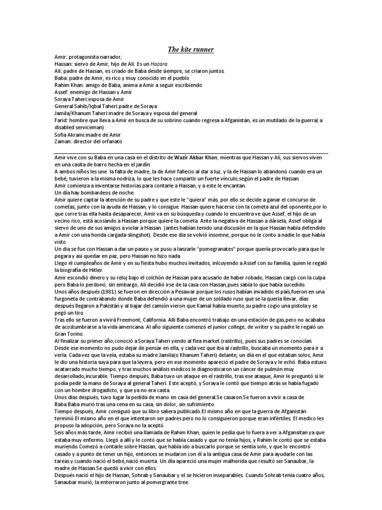 Amir: protagonista narrador, Hassan: siervo de Amir, hijo de Ali. Es un Hazara Ali: padre de Hassan, es criado de Baba desde siempre, se criaron juntos. Baba: padre de Amir, es rico y muy conocido en el pueblo Rahim Khan: amigo de Baba, anima a Amir a seguir escribiendo Assef: enemigo de Hassan y Amir Soraya Taheri:esposa de Amir General Sahib/Iqbal Taheri:padre de Soraya Jamila/Khanum Taheri:madre de Soraya y esposa del general Farid: hombre que lleva a Amir en busca de su sobrino cuando regresa a Afganistn, es un mutilado de la guerra( a disabled serviceman) Sofia Akrami:madre de Amir Zaman: director del orfanato Amir vive con su Baba en una casa en el distrito de Wazir Akbar Khan, mientras que Hassan y Ali, sus siervos viven en una casita de barro hecha en el jardn. A ambos nios les une la falta de madre, la de Amir fallecio al dar a luz, y la de Hassan lo abandon cuando era un beb; tuvieron a la misma nodriza, lo que les hace compartir un fuerte vnculo,segn el padre de Hassan. Amir comienza a inventarse historias para contarle a Hassan, y a este le encantan. Un da hay bombardeos de noche. Amir quiere captar la atencin de su padre y que este le quiera ms, por ello se decide a ganar el concurso de cometas, junto con la ayuda de Hassan, y lo consigue. Hassan quiere hacerse con la cometa azul del oponente,por lo que corre tras ella hasta desaparecer, Amir va en su bsqueda y cuando lo encuentra ve que Assef, el hijo de un vecino rico, est acosando a Hassan porque quiere la cometa. Ante la negativa de Hassan a drsela, Assef obliga al siervo de uno de sus amigos a violar a Hassan. (antes haban tenido una discusin en la que Hassan haba defendido a Amir con una honda cargada-slingshot). Desde ese dia se volvi insomne, porque no le conto a nadie lo que haba visto. Un dia se fue con Hassan a dar un paseo y se puso a lanzarle pomegranates porque quera provocarlo para que le pegara y asi quedar en paz, pero Hassan no hizo nada. Llego el cumpleaos de Amir y en su fiesta hubo muchos invitados, inlcuyendo a Assef con su familia, quien le regal la biografa de Hitler. Amir escondi dinero y su reloj bajo el colchn de Hassan para acusarlo de haber robado, Hassan carg con la culpa pero Baba lo perdon, sin embargo, Ali decidi irse de la casa con Hassan,pues saba lo que haba sucedido. Unos aos despus (1981) se fueron en direccin a Pesawar porque los rusos haban invadido el pas,fueron en una furgoneta de contrabando donde Baba defendi a una mujer de un soldado ruso que se la quera llevar, das despus llegaron a Pakistn y al bajar del camin vieron que Kamal haba muerto,su padre cogio una pistola y se peg un tiro. Tras ello se fueron a vivir Freemont, California. Alli Baba encontr trabajo en una estacin de gas,pero no acababa de acostumbrarse a la vida americana. Al ao siguiente comenz el junior college, de writer y su padre le regal un Gran Torino. Al finalizar su primer ao,conoci a Soraya Taheri yendo al flea market (rastrillo), pues sus padres se conocan. Desde ese momento no pudo dejar de pensar en ella, y cada vez que iba al rastrillo, buscaba un momento para ir a verla. Cada vez que la vea, estaba su madre Jamila(o Khanum Taheri) delante; un da en el que estaban solos, Amir le dio una historia suya para que la leyera, pero en ese momento apareci el padre de Soraya y le ech. Baba estuvo acatarrado mucho tiempo, y tras muchos anlisis mdicos le diagnosticaron un cncer de pulmn muy desarrollado,incurable. Tiempo despus, Baba tuvo un ataque en el rastrillo, tras ese ataque, Amir le pregunt si le poda pedir la mano de Soraya al general Taheri. Este acept, y Soraya le cont que tiempo atrs se haba fugado con un hombre drogadicto, y que ya no era casta. Unos das despus, tuvo lugar la pedida de mano en casa del general.Se casaron.Se fueron a vivir a casa de Baba.Baba muri tras una cena en su casa, sin dolor, sin sufrimiento. Tiempo despus, Amir consigui que su libro saliera publicado.El mismo ao en que la guerra de Afganistn termin.El mismo ao en el que intentaron ser padres pero no lo consiguieron porque eran infrtiles. El medico les propuso la adopcin, pero Soraya no la acept. Seis aos ms tarde, Amir recibi una llamada de Rahim Khan, quien le peda que lo fuera a ver a Afgansitan ya que estaba muy enfermo. Lleg a all y le cont que se haba casado y que no tena hijos, y Rahim le cont que se estaba muriendo.Comez a contarle sobre Hassan, que haba ido a buscarlo porque se senta solo, y que lo encontr casado y a punto de tener un hijo, entonces se mudaron con l a la antigua casa de Amir para ayudarle con las tareas y cuando naci el beb,naci muerta. Un da apareci una mujer malherida que result ser Sanaubar, la madre de Hassan.Se qued a vivir con ellos. Despus naci el hijo de Hassan, Sohrab y Sanaubar y el se hicieron inseparables. Cuando Sohrab tena cuatro aos, Sanaubar muri; la enterraron junto al pomergrante tree.
