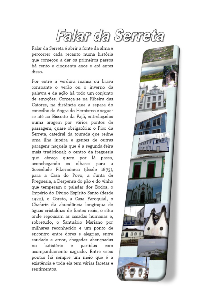 s h cento e cinquenta anos e at antes disso. Por entre a verdura mansa ou brava consoante o vero ou o inverno da palavra e da ao h todo um conjunto de emoes. Comea-se na Ribeira das Catorze, na distncia que a separa do concelho de Angra do Herosmo e seguese at ao Biscoito da Faj, entrelaados numa aragem por vrios pontos de passagem, quase obrigatria: o Pico da Serreta, catedral da tourada que rene uma ilha inteira e gentes de outras paragens naquela que a segunda-feira mais tradicional; o centro da freguesia que abraa quem por l passa, aconchegando os olhares para a Sociedade Filarmnica (desde 1873), para a Casa do Povo, a Junta de Freguesia, a Despensa do po e do vinho que temperam o paladar dos Bodos, o Imprio do Divino Esprito Santo (desde 1922), o Coreto, a Casa Paroquial, o Chafariz da abundncia longnqua de guas cristalinas de fontes reais, o stio onde repousam as ossadas humanas e, sobretudo, o Santurio Mariano por milhares reconhecido e um ponto de encontro entre dores e alegrias, entre saudade e amor, chegadas abenoadas no batistrio e partidas com acompanhamento sagrado. Entre estes pontos h sempre um meio que a existncia e toda ela tem vrias facetas e sentimentos.