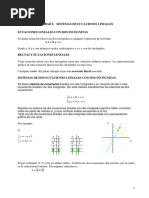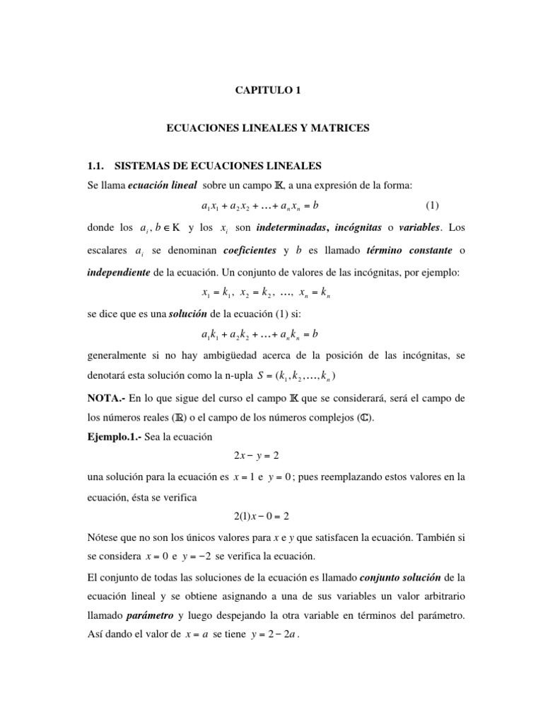 donde los ai , b K y los xi son indeterminadas, incgnitas o variables. Los escalares ai se denominan coeficientes y b es llamado trmino constante o independiente de la ecuacin. Un conjunto de valores de las incgnitas, por ejemplo: x1 = k1 , x 2 = k 2 , K , x n = k n se dice que es una solucin de la ecuacin (1) si: a1 k1 + a 2 k 2 + K + a n k n = b generalmente si no hay ambigedad acerca de la posicin de las incgnitas, se denotar esta solucin como la n-upla S = (k1 , k 2 , K , k n ) NOTA.- En lo que sigue del curso el campo K que se considerar, ser el campo de los nmeros reales (R) o el campo de los nmeros complejos (C). Ejemplo.1.- Sea la ecuacin
