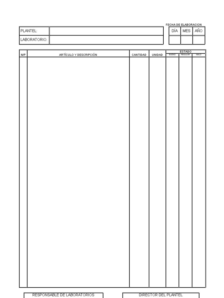INSTRUCCIONES: 1. Plantel: registrar nmero y/o localidad del plantel. 2. Laboratorio: el tipo de Laboratorio (Qumica, Fsica, Biologa o Multidisciplinario) para el plantel que solo cuenta con el inmueble. 3. Fecha de elaboracin: como lo indica el rubro. 4. N/P: nmero progresivo de cada articulo o descripcin, reanudando al No. 1 cuando describa mobiliario, material y reactivos, y equipo en dicho orden. 5. Articulo y descripcin: registro en orden alfabtico los materiales en el siguiente orden: a) Mobiliario, b) Materia (cristalera, metal porcelana), c) Reactivos Qumicos (solo con los que cuenta, los caducados darlos de baja), y d) Equipo (microscopios, balanzas material afn). 6. Cantidad: registrar el nmero de piezas existentes en el laboratorio. 7. Unidad: utilizar para describir piezas, mililitros, frasco y gramos, etc. 8. Estado (bueno, malo o regular) sealar la columna en la que se encuentra el articulo, o con nmero si el articulo se encuentra en estado diferente por ejemplo: