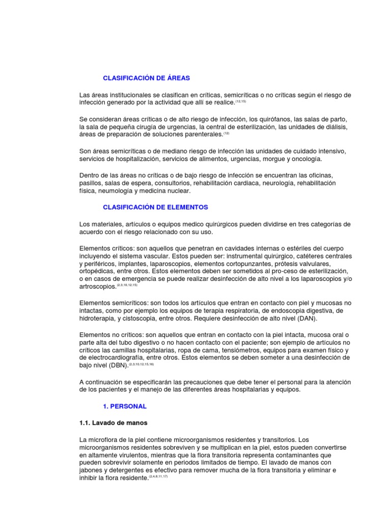 que all se realice.(12,15) Se consideran reas crticas o de alto riesgo de infeccin, los quirfanos, las salas de parto, la sala de pequea ciruga de urgencias, la central de esterilizacin, las unidades de dilisis, reas de preparacin de soluciones parenterales.(12) Son reas semicrticas o de mediano riesgo de infeccin las unidades de cuidado intensivo, servicios de hospitalizacin, servicios de alimentos, urgencias, morgue y oncologa. Dentro de las reas no crticas o de bajo riesgo de infeccin se encuentran las oficinas, pasillos, salas de espera, consultorios, rehabilitacin cardiaca, neurologa, rehabilitacin fsica, neumologa y medicina nuclear. CLASIFICACIN DE ELEMENTOS Los materiales, artculos o equipos medico quirrgicos pueden dividirse en tres categoras de acuerdo con el riesgo relacionado con su uso. Elementos crticos: son aquellos que penetran en cavidades internas o estriles del cuerpo incluyendo el sistema vascular. Estos pueden ser: instrumental quirrgico, catteres centrales y perifricos, implantes, laparoscopios, elementos cortopunzantes, prtesis valvulares, ortopdicas, entre otros. Estos elementos deben ser sometidos al pro-ceso de esterilizacin, o en casos de emergencia se puede realizar desinfeccin de alto nivel a los laparoscopios y/o artroscopios.(2,3,10,12,15) Elementos semicrticos: son todos los artculos que entran en contacto con piel y mucosas no intactas, como por ejemplo los equipos de terapia respiratoria, de endoscopia digestiva, de hidroterapia, y cistoscopia, entre otros. Requiere desinfeccin de alto nivel (DAN). Elementos no crticos: son aquellos que entran en contacto con la piel intacta, mucosa oral o parte alta del tubo digestivo o no hacen contacto con el paciente; son ejemplo de artculos no crticos las camillas hospitalarias, ropa de cama, tensimetros, equipos para examen fsico y de electrocardiografa, entre otros. Estos elementos se deben someter a una desinfeccin de bajo nivel (DBN).(2,3,10,12,15,16) A continuacin se especificarn las precauciones que debe tener el personal para la atencin de los pacientes y el manejo de las diferentes reas hospitalarias y equipos. 1. PERSONAL 1.1. Lavado de manos La microflora de la piel contiene microorganismos residentes y transitorios. Los microorganismos residentes sobreviven y se multiplican en la piel, estos pueden convertirse en altamente virulentos, mientras que la flora transitoria representa contaminantes que pueden sobrevivir solamente en periodos limitados de tiempo. El lavado de manos con jabones y detergentes es efectivo para remover mucha de la flora transitoria y eliminar e inhibir la flora residente.(2,4,8,11,17)