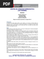 Dosis y admi nistracin 5 a 7 mgkg por dosis cada 24 horas mediante jeringa-bomba para infusin IV en un lapso de 2 horas. indicaciones Tratamiento de infecciones sistmicas por hongos resistentes al tratamiento convencional con anfotericina B o pacientes con disfuncin renal o heptica. Vigilancia N o se da seguimiento rutinario a las concentraciones plasmticas de anfotericina B liposoma. Vigilar la excrecin de orina. Hemograma completo peridico para detectar trombocitopenia, electrlitos por la hipopotasemia, BUN, creatinina en plasma y transaminasas hepticas. Efectos a d v e r s o s l ~ r e c a u c i o n e s Anemia, trombocitopenia, hipopotasemia, nuseas, vmito y fiebre con escalofros. Farmacologa AmBisome'*' consiste en anfotericina B integrada a una sola bicapa liposomal en el interior de un sistema de liberacin del frmaco. Acta unindose al componente esterol de la membrana celular y altera la permeabilidad de la pared celular lo que ocasiona la muerte de la clula. Atraviesa la pared celular de hongos susceptibles. Se concentra en hgado y bazo, pero penetra el SNC en menor proporcin comparada con la anfotericina B convencional. Muestra n-ienor nefrotoxicidad que anfotericina B convencional. En adultos, la vida media en suero es 24 a 38 horas. Anfotericina B liposoma sigue una farmacocintica no lineal. Consideraciones especiales/Preparacin Disponible como polvo para inyeccin en frascos mpula de 50 mg. Reconstituir con 12 ml de agua inyectable hasta una concentracin de 4 mglml. En seguida agitar con fuerza el frasco durante 30 segundos. Verificar si la dispersin es completa. La suspensin reconstituida permanece estable durante 24 horas en refrigeracin. N o congelar. Proteger de la luz. Antes de administrar AmBisome" debe diluirse con DSoh a una concentracin final menor de 2 mg/ml. Se puede preparar una dilucin de 1 mgml filtrando (con filtro de 5 micrones) 1 ml de la solucin reconstituida en 3 ml de D5%. Utilizar un filtro por cada frasco de AmBisome". La dilucin debe emplearse de inmediato. N o inyectar AMBISOMEm como inyeccin I V rpida, o mezclar con soluciones salinas-puede ocurrir precipitacin.