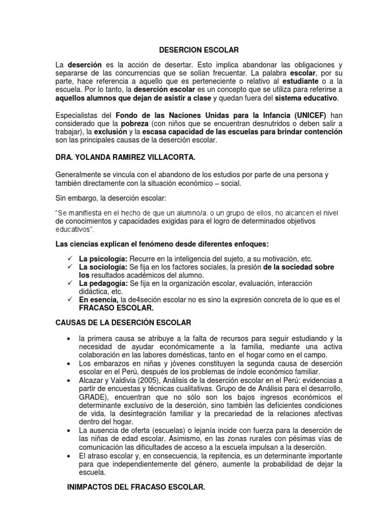 Esto implica abandonar las obligaciones y separarse de las concurrencias que se solan frecuentar. La palabra escolar, por su parte, hace referencia a aquello que es perteneciente o relativo al estudiante o a la escuela. Por lo tanto, la desercin escolar es un concepto que se utiliza para referirse a aquellos alumnos que dejan de asistir a clase y quedan fuera del sistema educativo. Especialistas del Fondo de las Naciones Unidas para la Infancia (UNICEF) han considerado que la pobreza (con nios que se encuentran desnutridos o deben salir a trabajar), la exclusin y la escasa capacidad de las escuelas para brindar contencin son las principales causas de la desercin escolar. DRA. YOLANDA RAMIREZ VILLACORTA. Generalmente se vincula con el abandono de los estudios por parte de una persona y tambin directamente con la situacin econmico social. Sin embargo, la desercin escolar: Se manifiesta en el hecho de que un alumno/a. o un grupo de ellos, no alcancen el nivel de conocimientos y capacidades exigidas para el logro de determinados objetivos educativos. Las ciencias explican el fenmeno desde diferentes enfoques: La psicologa: Recurre en la inteligencia del sujeto, a su motivacin, etc. La sociologa: Se fija en los factores sociales, la presin de la sociedad sobre los resultados acadmicos del alumno. La pedagoga: Se fija en la organizacin escolar, evaluacin, interaccin didctica, etc. En esencia, la de4secin escolar no es sino la expresin concreta de lo que es el FRACASO ESCOLAR. CAUSAS DE LA DESERCIN ESCOLAR la primera causa se atribuye a la falta de recursos para seguir estudiando y la necesidad de ayudar econmicamente a la familia, mediante una activa colaboracin en las labores domsticas, tanto en el hogar como en el campo. Los embarazos en nias y jvenes constituyen la segunda causa de desercin escolar en el Per, despus de los problemas de ndole econmico familiar. Alcazar y Valdivia (2005), Anlisis de la desercin escolar en el Per: evidencias a partir de encuestas y tcnicas cualitativas. Grupo de de Anlisis para el desarrollo, GRADE), encuentran que no slo son los bajos ingresos econmicos el determinante exclusivo de la desercin, sino tambin las deficientes condiciones de vida, la desintegracin familiar y la precariedad de la relaciones afectivas dentro del hogar. La ausencia de oferta (escuelas) o lejana incide con fuerza para la desercin de las nias de edad escolar. Asimismo, en las zonas rurales con psimas vas de comunicacin las dificultades de acceso a la escuela impulsan a la desercin. El atraso escolar y, en consecuencia, la repitencia, es un determinante importante para que independientemente del gnero, aumente la probabilidad de dejar la escuela.