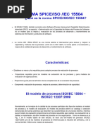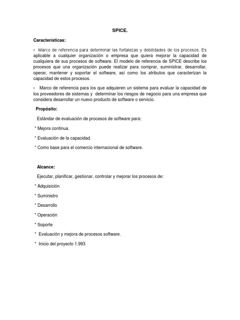 Caractersticas: Marco de referencia para determinar las fortalezas y debilidades de los procesos. Es aplicable a cualquier organizacin o empresa que quiera mejorar la capacidad de cualquiera de sus procesos de software. El modelo de referencia de SPICE describe los procesos que una organizacin puede realizar para comprar, suministrar, desarrollar, operar, mantener y soportar el software, as como los atributos que caracterizan la capacidad de estos procesos. Marco de referencia para los que adquieren un sistema para evaluar la capacidad de los proveedores de sistemas y determinar los riesgos de negocio para una empresa que considera desarrollar un nuevo producto de software o servicio. Propsito: Estndar de evaluacin de procesos de software para: * Mejora continua. * Evaluacin de la capacidad. * Como base para el comercio internacional de software.
