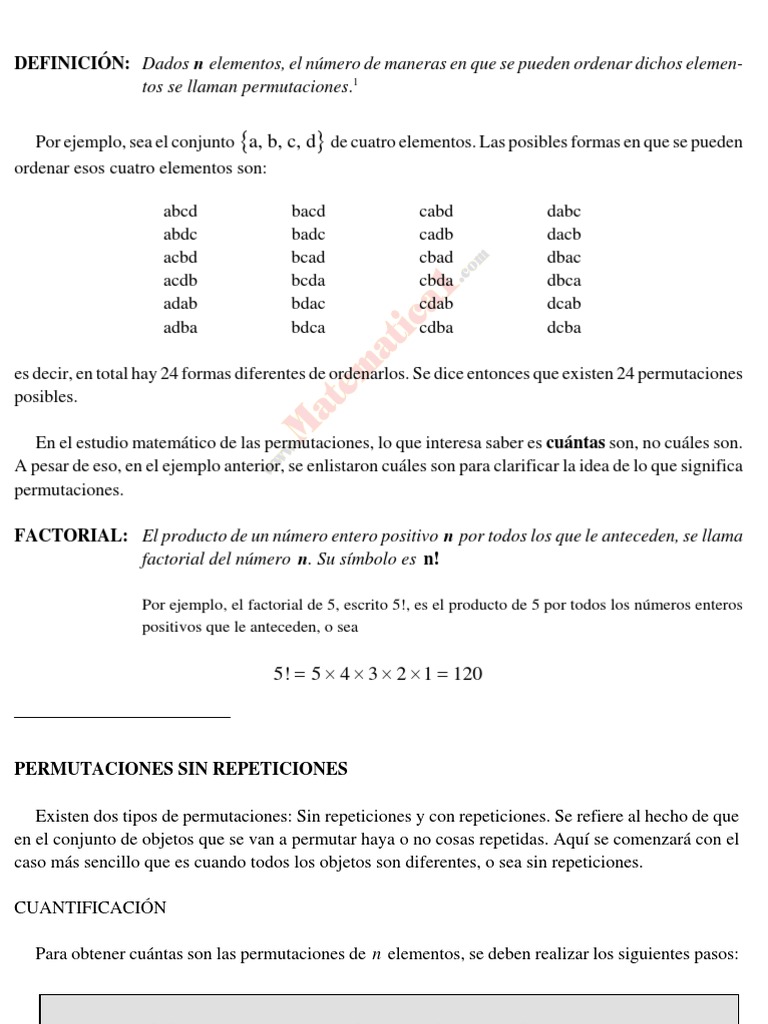 1 Por ejemplo, sea el conjunto {a, b, c, d} de cuatro elementos. Las posibles formas en que se pueden ordenar esos cuatro elementos son: abcd abdc acbd acdb adab adba bacd badc bcad bcda bdac bdca cabd cadb cbad cbda cdab cdba dabc dacb dbac dbca dcab dcba