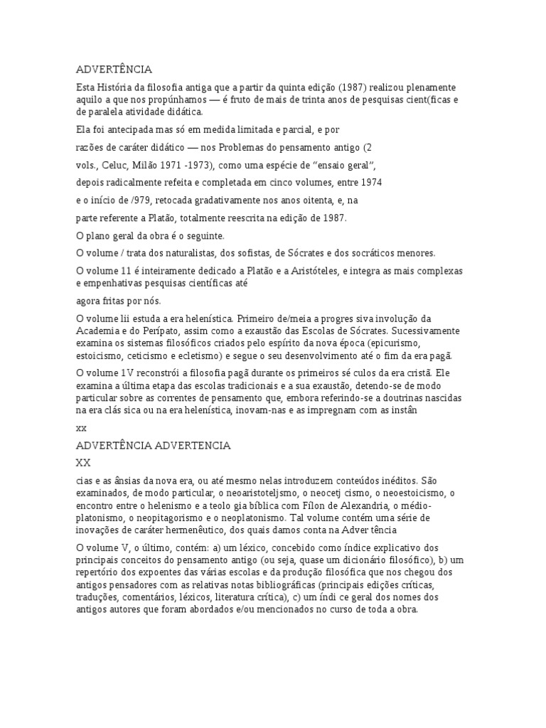 propnhamos fruto de mais de trinta anos de pesquisas cient(ficas e de paralela atividade didtica. Ela foi antecipada mas s em medida limitada e parcial, e por razes de carter didtico nos Problemas do pensamento antigo (2 vols., Celuc, Milo 1971 -1973), como uma espcie de ensaio geral, depois radicalmente refeita e completada em cinco volumes, entre 1974 e o incio de /979, retocada gradativamente nos anos oitenta, e, na parte referente a Plato, totalmente reescrita na edio de 1987. O plano geral da obra o seguinte. O volume / trata dos naturalistas, dos sofistas, de Scrates e dos socrticos menores. O volume 11 inteiramente dedicado a Plato e a Aristteles, e integra as mais complexas e empenhativas pesquisas cientficas at agora fritas por ns. O volume lii estuda a era helenstica. Primeiro de/meia a progres siva involuo da Academia e do Perpato, assim como a exausto das Escolas de Scrates. Sucessivamente examina os sistemas filosficos criados pelo esprito da nova poca (epicurismo, estoicismo, ceticismo e ecletismo) e segue o seu desenvolvimento at o fim da era pag. O volume 1V reconstri a filosofia pag durante os primeiros s culos da era crist. Ele examina a ltima etapa das escolas tradicionais e a sua exausto, detendo-se de modo particular sobre as correntes de pensamento que, embora referindo-se a doutrinas nascidas na era cls sica ou na era helenstica, inovam-nas e as impregnam com as instn xx ADVERTNCIA ADVERTENCIA XX cias e as nsias da nova era, ou at mesmo nelas introduzem contedos inditos. So examinados, de modo particular, o neoaristoteljsmo, o neocetj cismo, o neoestoicismo, o encontro entre o helenismo e a teolo gia bblica com Flon de Alexandria, o mdioplatonismo, o neopitagorismo e o neoplatonismo. Tal volume contm uma srie de inovaes de carter hermenutico, dos quais damos conta na Adver tncia O volume V, o ltimo, contm: a) um lxico, concebido como ndice explicativo dos principais conceitos do pensamento antigo (ou seja, quase um dicionrio filosfico), b) um repertrio dos expoentes das vrias escolas e da produo filosfica que nos chegou dos antigos pensadores com as relativas notas bibliogrficas (principais edies crticas, tradues, comentrios, lxicos, literatura crtica), c) um ndi ce geral dos nomes dos antigos autores que foram abordados e/ou mencionados no curso de toda a obra.