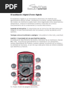 El multmetro analgico, que tambin se lo conoce como Tester o Multitester, posee partes elctricas y mecnicas; mientras que el Multmetro Digital es un instrumento completamente electrnico que est reemplazando al Tester por diversas razones: es ms fcil de usar, su respuesta en tiempo es superior, no cambia la carga de la mayora de los circuitos y son ms baratos. Ambos aparatos suelen estar adaptados para otras funciones, como medir capacidades de condensadores, comprobar diodos y transistores, medir temperaturas a travs de una termocupla, medir frecuencias, etc. Los multmetros deben configurarse y conectarse apropiadamente dependiendo de lo que se quiera medir con ellos. Por lo cual poseen, principalmente, un selector de funciones, varios bornes de entrada y un selector de escala. Es entonces importante conocer como usarlos correctamente.