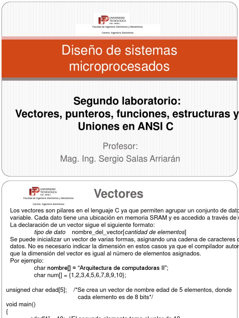 Los vectores son pilares en el lenguaje C ya que permiten agrupar un conjunto de dato variable. Cada dato tiene una ubicacin en memoria SRAM y es accedido a travs de u La declaracin de un vector sigue el siguiente formato: tipo de dato nombre_del_vector[cantidad de elementos] Se puede inicializar un vector de varias formas, asignando una cadena de caracteres o datos. No es necesario indicar la dimensin en estos casos ya que el compilador autom que la dimensin del vector es igual al nmero de elementos asignados. Por ejemplo: char nombre[] = Arquitectura de computadoras II; char num[] = {1,2,3,4,5,6,7,8,9,10}; unsigned char edad[5]; /*Se crea un vector de nombre edad de 5 elementos, donde cada elemento es de 8 bits*/