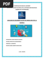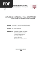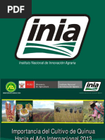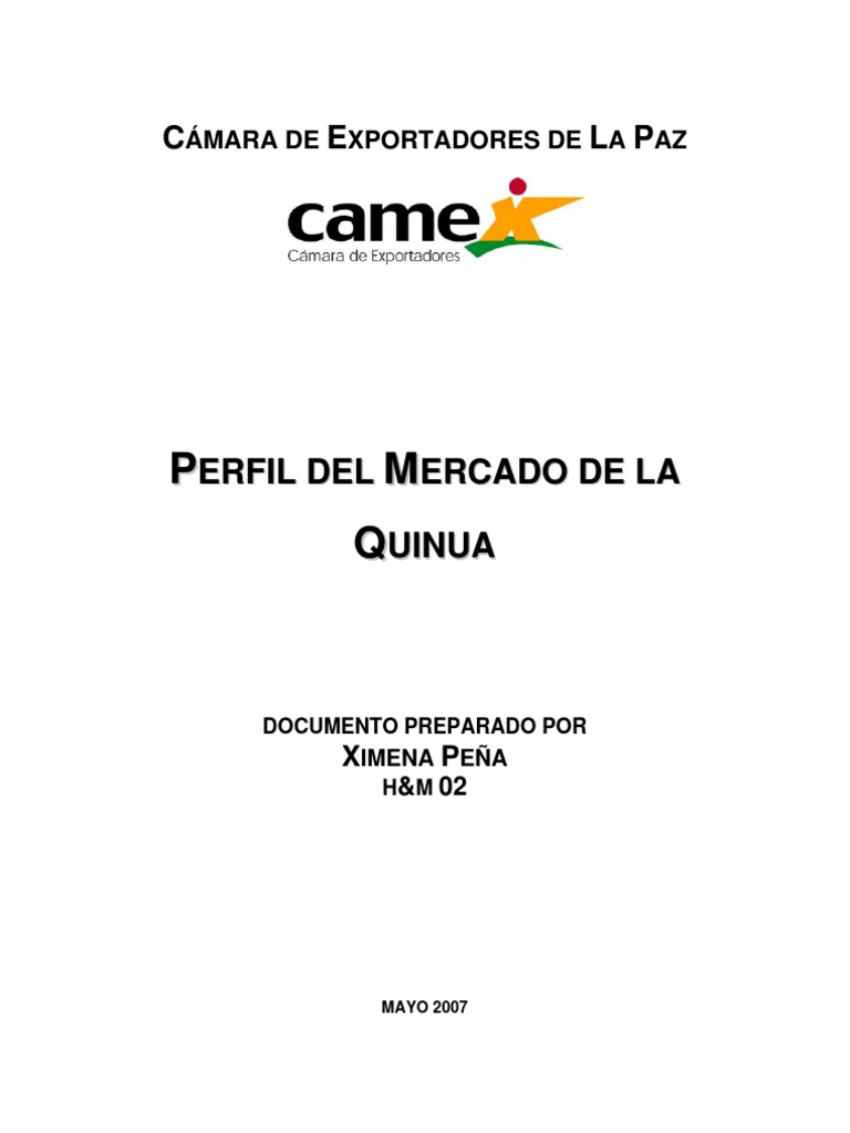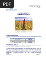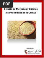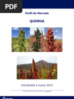SUMARIO EJECUTIVO El presente perfil de mercado, pretende dar a conocer las bondades de la QUINUA que Bolivia como uno de los mayores productores del mismo debe prestar especial inters, no solo por su potencial exportador si no tambin por la oferta exportable y sus cualidades en s. Describe al producto, se realiza un anlisis cuantitivo y cualitativo del mercado internacional de la quinua, da a conocer datos estadsticos, analizando tambin la participacin de Bolivia en el mercado internacional y la perspectiva de diversificacin de mercado del producto, crecimiento de la demanda de este tipo productos, as como tambin contactos para la promocin comercial y las ventas, precios referenciales a nivel mundial, acuerdos y preferencias arancelarias y direcciones tiles para recabar informacin referente a la quinua a nivel nacional e internacional.
