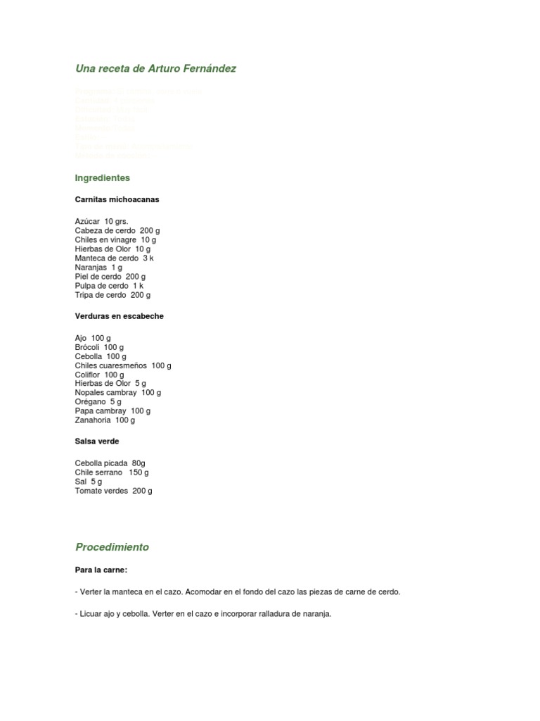 latas), el calculo de la manteca necesaria es en relacin con la carne que vayas a preparar, pero siempre debe cubrir la carne. Una vez que la manteca esta caliente (sin que se queme) ve poniendo la carne poco a poco ayudndote con la cuchara de madera grande para evitar accidentes o quemaduras, la carne debe estar bien lavada y seca para el momento de agregarla. Primero pon la carne maciza, la costilla y la espaldilla, pasados unos 20 minutos puedes agregar el cuero grueso, luego el buche y finalmente la nana; si tu quieres hacer cueritos delgados ponlos casi al final de la coccin de manera de que los ests cuidando para que no se pasen y queden duros, estos se sacan antes de que se terminen de hacer las carnitas, verifica solamente que estn bien cocidos. Las hierbas de olor (un buen manojo o dos) se agregan justo despus de agregar la maciza, la espaldilla y la costilla, dentro de un costalito de manta de cielo cerrado para que estas no se salgan y solo dejen escapar el sabor. Recuerda que el manojo de hierbas de olor debe contener: Laurel, Tomillo y Mejorana y lo puedes encontrar en cualquier mercado o tiendas de autoservicio. Disuelve 90 gr de sal preferentemente de mar (para 6Kg. de carne) en el litro y medio de agua, luego con mucho cuidado agrega esta mezcla en el cazo donde tienes la carne (esto se agrega un instante antes de agregar las hierbas), recuerda, con mucho cuidado! Una vez que las carnitas empiezan a tomar color, debers tener cuidado de que no se quemen, deben tener un color oro oscuro, muevelas para que tomen este color parejo. Una vez que se cueza bien la carne (sin que se queme) retirala y ponla en un colador sobre el cazo para que escurra la grasa No hace falta que les pongas nada mas que lo que aqu se explica, ni leche ni jugo de naranja ni ningn refresco de cola. Eso si, si las quieres un poco ms obscuras: en vez de agregar toda la sal, pon mitad de sal y mitad de tequezquite, el tequezquite sale de las lagunas, es la capa fina de sal que va dejando el agua de la laguna cuando se va secando, lo puedes encontrar en el mercado. Para que las carnitas tengan ms sabor, puedes agregar el hgado, los riones y la pajarilla, todas estas vsceras del cerdo. Puedes agregar tambin una o dos trompas de cerdo, dile a tu carnicero que te limpie una o dos cabezas y de ah salen estas partes, incluyendo las orejas. SUPER IMPORTANTE LAVAR BIEN EL CAZO DE COBRE SI ES QUE LO VAS A UTILIZAR PORQUE SI NO LAS CARNITAS VAN A SABER A MONEDA EH?? Ya que estan listas puedes prepararte tacos o tortas de carnitas buenisimos a los que les puedes poner limn, una salsa bien picosa y guacamole, cualquier duda estoy a tus ordenes.