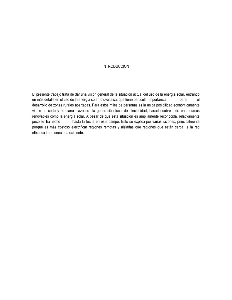 El presente trabajo trata de dar una visin general de la situacin actual del uso de la energa solar, entrando en ms detalle en el uso de la energa solar fotovoltaica, que tiene particular importancia para el desarrollo de zonas rurales apartadas. Para estos miles de personas es la nica posibilidad econmicamente viable a corto y mediano plazo es la generacin local de electricidad, basada sobre todo en recursos renovables como la energa solar. A pesar de que esta situacin es ampliamente reconocida, relativamente poco se ha hecho hasta la fecha en este campo. Esto se explica por varias razones, principalmente porque es ms costoso electrificar regiones remotas y aisladas que regiones que estn cerca a la red elctrica interconectada existente.