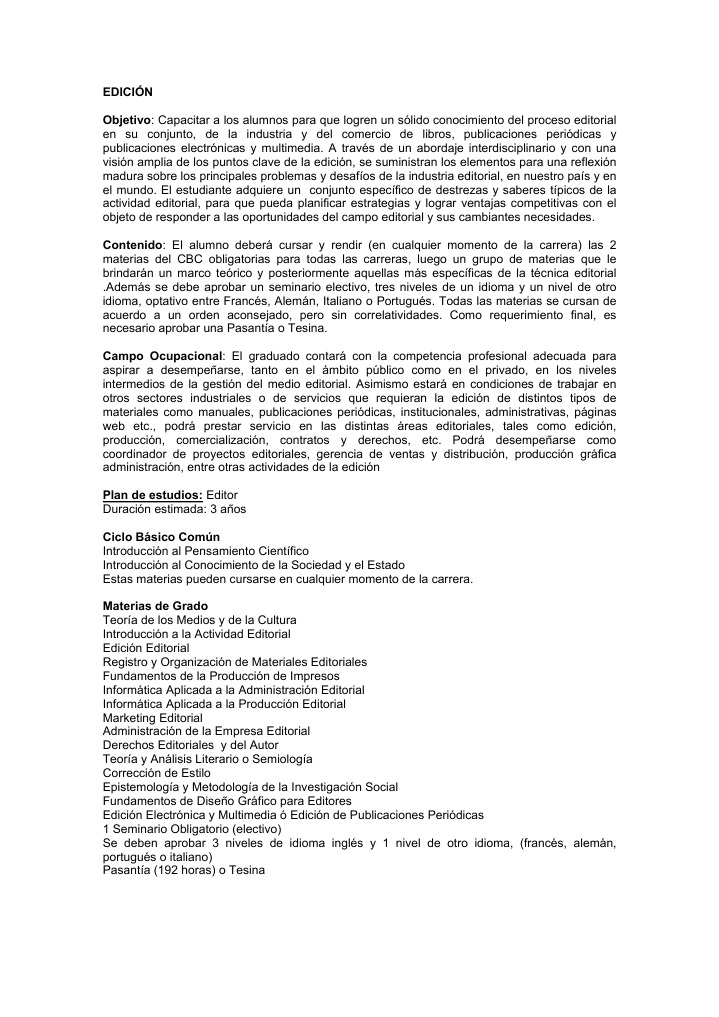 y del comercio de libros, publicaciones peridicas y publicaciones electrnicas y multimedia. A travs de un abordaje interdisciplinario y con una visin amplia de los puntos clave de la edicin, se suministran los elementos para una reflexin madura sobre los principales problemas y desafos de la industria editorial, en nuestro pas y en el mundo. El estudiante adquiere un conjunto especfico de destrezas y saberes tpicos de la actividad editorial, para que pueda planificar estrategias y lograr ventajas competitivas con el objeto de responder a las oportunidades del campo editorial y sus cambiantes necesidades. Contenido: El alumno deber cursar y rendir (en cualquier momento de la carrera) las 2 materias del CBC obligatorias para todas las carreras, luego un grupo de materias que le brindarn un marco terico y posteriormente aquellas ms especficas de la tcnica editorial .Adems se debe aprobar un seminario electivo, tres niveles de un idioma y un nivel de otro idioma, optativo entre Francs, Alemn, Italiano o Portugus. Todas las materias se cursan de acuerdo a un orden aconsejado, pero sin correlatividades. Como requerimiento final, es necesario aprobar una Pasanta o Tesina. Campo Ocupacional: El graduado contar con la competencia profesional adecuada para aspirar a desempearse, tanto en el mbito pblico como en el privado, en los niveles intermedios de la gestin del medio editorial. Asimismo estar en condiciones de trabajar en otros sectores industriales o de servicios que requieran la edicin de distintos tipos de materiales como manuales, publicaciones peridicas, institucionales, administrativas, pginas web etc., podr prestar servicio en las distintas reas editoriales, tales como edicin, produccin, comercializacin, contratos y derechos, etc. Podr desempearse como coordinador de proyectos editoriales, gerencia de ventas y distribucin, produccin grfica administracin, entre otras actividades de la edicin Plan de estudios: Editor Duracin estimada: 3 aos Ciclo Bsico Comn Introduccin al Pensamiento Cientfico Introduccin al Conocimiento de la Sociedad y el Estado Estas materias pueden cursarse en cualquier momento de la carrera. Materias de Grado Teora de los Medios y de la Cultura Introduccin a la Actividad Editorial Edicin Editorial Registro y Organizacin de Materiales Editoriales Fundamentos de la Produccin de Impresos Informtica Aplicada a la Administracin Editorial Informtica Aplicada a la Produccin Editorial Marketing Editorial Administracin de la Empresa Editorial Derechos Editoriales y del Autor Teora y Anlisis Literario o Semiologa Correccin de Estilo Epistemologa y Metodologa de la Investigacin Social Fundamentos de Diseo Grfico para Editores Edicin Electrnica y Multimedia Edicin de Publicaciones Peridicas 1 Seminario Obligatorio (electivo) Se deben aprobar 3 niveles de idioma ingls y 1 nivel de otro idioma, (francs, alemn, portugus o italiano) Pasanta (192 horas) o Tesina