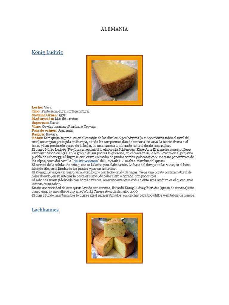 Leche: Vaca Tipo: Pasta semi dura, corteza natural Materia Grasa: 55% Maduracin: Ms de 4 meses Aspereza: Suave Vino: Gewrztraminer, Riesling o Cerveza Pas de origen: Alemania Regin: Baviera Notas: Este queso se produce en el corazn de los frtiles Alpes bvaros (a 2.000 metros sobre el nivel del mar) una regin protegida en Europa, donde los campesinos dan de comer a las vacas la hierba fresca o el heno, y han producido queso de la leche, de una manera totalmente natural desde hace siglos. El queso Knig Ludwig (Rey Lus en espaol) lo elabora la Schnegger Kse-Alm. El maestro quesero, Sepp Krnauer fund en 1988 en la granja de sus padres la quesera, en el corazn de la alta Baviera en el pequeo pueblo de Schnegg. El lugar se encuentra en medio de prados verdes y olorosos con una vista panormica de los Alpes, cerca del castillo "Neuschwanstein" del Rey Lus II. De ah el nombre del queso. El secreto de la calidad de este queso es la leche y su elaboracin. La base del forraje de las vacas, es el heno libre de silo, es la hierba de los prados y pastos naturales. El Knig Ludwig es un queso semi duro hecho con leche cruda de vacas. Tiene una bonita corteza natural de color dorado, en su interior la pasta es suave, de color claro a dorado, con pocos ojos. El sabor es suave y delicado con notas a nueces, aromticamente suave. Cuanto ms maduro es el queso, ms intenso es su sabor. Existe una variedad de este queso lavado con cerveza, llamado Knig Ludwig Bierkse (queso de cerveza) este queso gan la medalla de oro en el World Cheese Awards del ao. 2006. El queso funde muy bien, por lo que es ideal para gratinados, en lonchas para bocadillos y en tablas de quesos.
