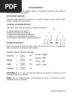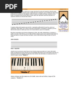 Lneas divisorias: El espacio entre dos lneas divisorias se llama COMPS En el ejemplo superior cada pentagrama contiene: - Cuatro compases de 4 tiempos cada uno - El nmero superior (4) marca cuantas figuras habr en cada comps. - El nmero inferior de la fraccin marca la figura elegida Explicacin As como cuando queremos medir algo slido, utilizamos la unidad de medida llamada METRO, y as como cuando queremos medir algo lquido, utilizamos la unidad de medida llamada LITRO En la msica utilizaremos la unidad de medida o figura llamada REDONDA cuyo valor es de cuatro tiempos. Por lo tanto el 4 representar a la figura llamada NEGRA porque necesito 4 negras para una REDONDA, el ltimo comps contiene justamente la figura llamada REDONDA PRCTICA Vamos a practicar en nuestro teclado. 1.- Primero vamos a marcar con nuestro pi izquierdo cada uno de los tiempos en forma pareja, a esta marca la llamaremos PULSO, una vez establecido el pulso o velocidad tocaremos primero con una mano y luego con las dos simultneamente los cuatro compases del ejemplo superior, respetando el dedo que corresponde a cada nota. 2.- En nuestro segundo ejercicio, inmediatamente debajo de este texto, pondremos atencin especial al nombre de cada una de las notas que tocamos, observando que cada una de ellas tienen dos nombres posibles Recordar : C=Do // D=Re // E=Mi // F=Fa // G=Sol // A=La // B=Si