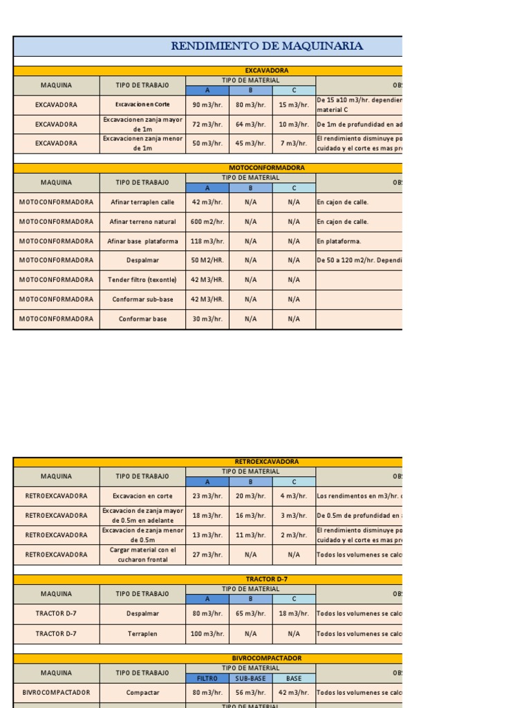 OBSERVACIONES Los rendimentos en m3/hr. dependen del estado de la maquina De 0.5m de profundidad en adelante. El rendimiento disminuye por el tipo de trabajo que es de mayor cuidado y el corte es mas preciso Todos los volumenes se calculan en metros cubicos compactos