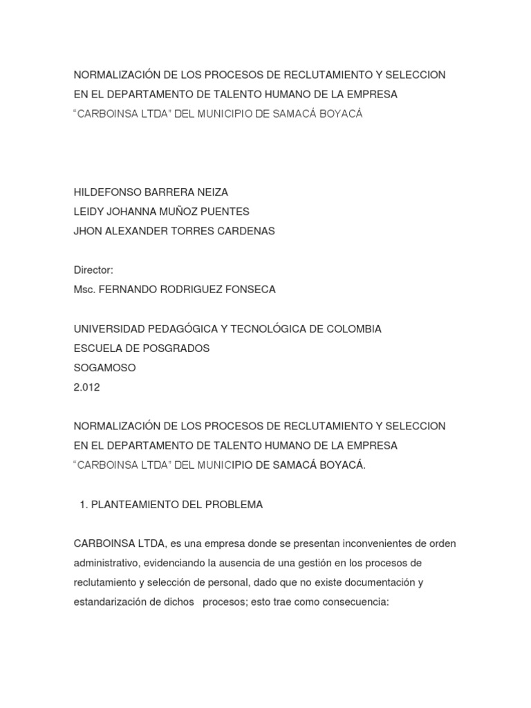 NORMALIZACIN DE LOS PROCESOS DE RECLUTAMIENTO Y SELECCION EN EL DEPARTAMENTO DE TALENTO HUMANO DE LA EMPRESA CARBOINSA LTDA DEL MUNICIPIO DE SAMAC BOYAC.