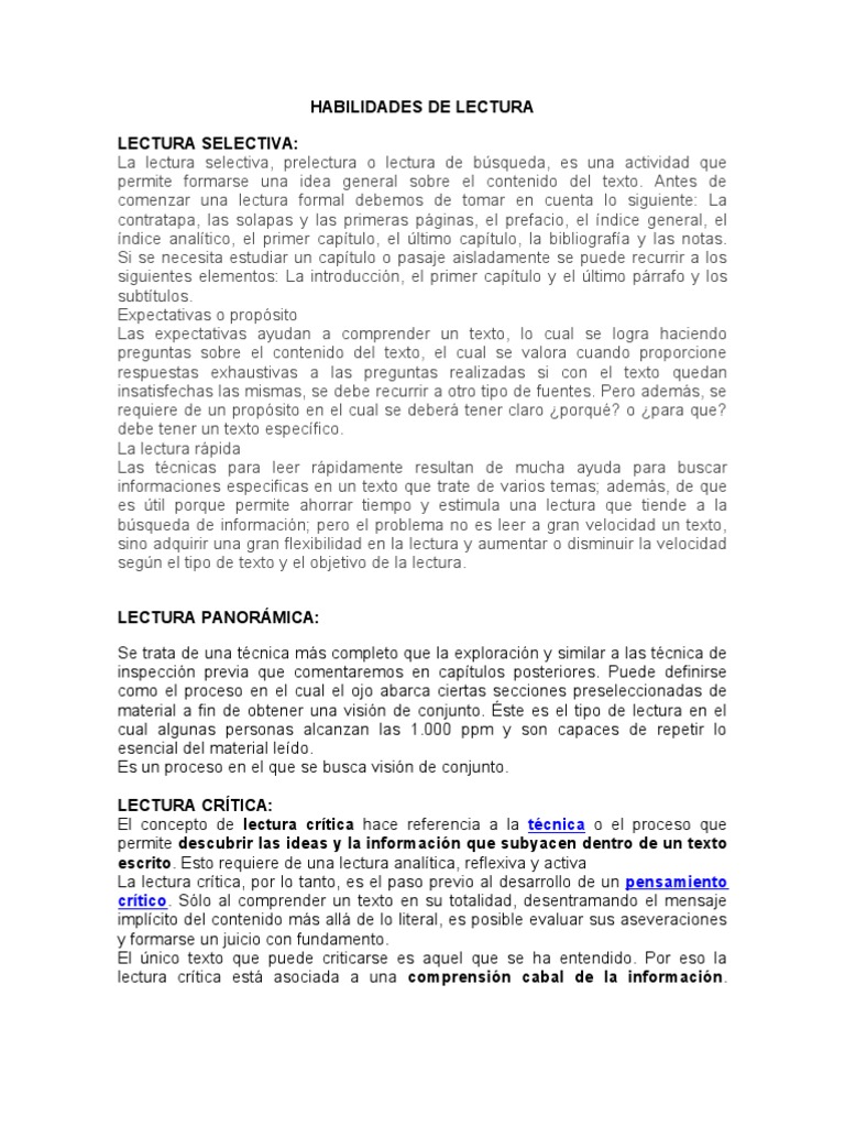 idea general sobre el contenido del texto. Antes de comenzar una lectura formal debemos de tomar en cuenta lo siguiente: La contratapa, las solapas y las primeras pginas, el prefacio, el ndice general, el ndice analtico, el primer captulo, el ltimo captulo, la bibliografa y las notas. Si se necesita estudiar un captulo o pasaje aisladamente se puede recurrir a los siguientes elementos: La introduccin, el primer captulo y el ltimo prrafo y los subttulos. Expectativas o propsito Las expectativas ayudan a comprender un texto, lo cual se logra haciendo preguntas sobre el contenido del texto, el cual se valora cuando proporcione respuestas exhaustivas a las preguntas realizadas si con el texto quedan insatisfechas las mismas, se debe recurrir a otro tipo de fuentes. Pero adems, se requiere de un propsito en el cual se deber tener claro porqu? o para que? debe tener un texto especfico. La lectura rpida Las tcnicas para leer rpidamente resultan de mucha ayuda para buscar informaciones especificas en un texto que trate de varios temas; adems, de que es til porque permite ahorrar tiempo y estimula una lectura que tiende a la bsqueda de informacin; pero el problema no es leer a gran velocidad un texto, sino adquirir una gran flexibilidad en la lectura y aumentar o disminuir la velocidad segn el tipo de texto y el objetivo de la lectura. LECTURA PANORMICA: Se trata de una tcnica ms completo que la exploracin y similar a las tcnica de inspeccin previa que comentaremos en captulos posteriores. Puede definirse como el proceso en el cual el ojo abarca ciertas secciones preseleccionadas de material a fin de obtener una visin de conjunto. ste es el tipo de lectura en el cual algunas personas alcanzan las 1.000 ppm y son capaces de repetir lo esencial del material ledo. Es un proceso en el que se busca visin de conjunto. LECTURA CRTICA: El concepto de lectura crtica hace referencia a la tcnica o el proceso que permite descubrir las ideas y la informacin que subyacen dentro de un texto escrito. Esto requiere de una lectura analtica, reflexiva y activa La lectura crtica, por lo tanto, es el paso previo al desarrollo de un pensamiento crtico. Slo al comprender un texto en su totalidad, desentramando el mensaje implcito del contenido ms all de lo literal, es posible evaluar sus aseveraciones y formarse un juicio con fundamento. El nico texto que puede criticarse es aquel que se ha entendido. Por eso la lectura crtica est asociada a una comprensin cabal de la informacin.