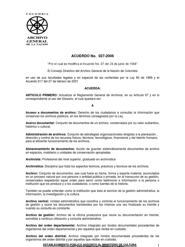 Por el cual se modifica el Acuerdo No. 07 del 29 de junio de 1994 El Consejo Directivo del Archivo General de la Nacin de Colombia en uso de sus facultades legales y en especial de las conferidas por la Ley 80 de 1989 y el Acuerdo 017 del 27 de febrero de 2001 ACUERDA: ARTICULO PRIMERO: Actualizar el Reglamento General de Archivos, en su Artculo 67 y en lo correspondiente al uso del Glosario, el cual quedar as: A Acceso a documentos de archivo: Derecho de los ciudadanos a consultar la informacin que conservan los archivos pblicos, en los trminos consagrados por la Ley. Acervo documental: Conjunto de documentos de un archivo, conservados por su valor sustantivo, histrico o cultural. Administracin de archivos: Conjunto de estrategias organizacionales dirigidas a la planeacin , direccin y control de los recursos fsicos, tcnicos, tecnolgicos, financieros y del talento humano, para el eficiente funcionamiento de los archivos. Almacenamiento de documentos: Accin de guardar sistemticamente documentos de archivo en espacios, mobiliario y unidades de conservacin apropiadas. Archivista: Profesional del nivel superior, graduado en archivstica. Archivstica: Disciplina que trata los aspectos tericos, prcticos y tcnicos de los archivos. Archivo: Conjunto de documentos, sea cual fuere su fecha, forma y soporte material, acumulados en un proceso natural por una persona o entidad pblica o privada, en el transcurso de su gestin, conservados respetando aquel orden para servir como testimonio e informacin a la persona o institucin que los produce y a los ciudadanos, o como fuentes de la historia. Tambin se puede entender como la institucin que sta al servicio de la gestin administrativa, la informacin, la investigacin y la cultura. Archivo central: Unidad administrativa que coordina y controla el funcionamiento de los archivos de gestin y rene los documentos transferidos por los mismos una vez finalizado su trmite y cuando su consulta es constante. Archivo de gestin: Archivo de la oficina productora que rene su documentacin en trmite, sometida a continua utilizacin y consulta administrativa. Archivo del orden departamental: Archivo integrado por fondos documentales procedentes de organismos del orden departamental y por aquellos que recibe en custodia. Archivo del orden distrital: Archivo integrado por fondos documentales procedentes de los organismos del orden distrital y por aquellos que recibe en custodia.