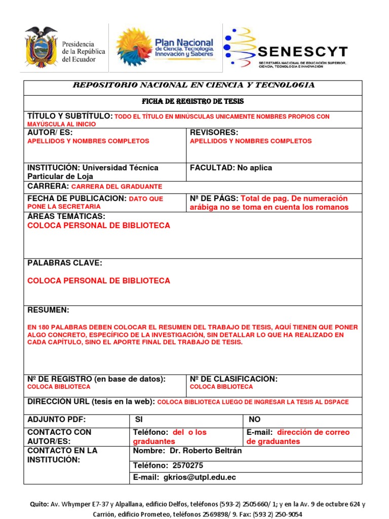 Telfono: del o los E-mail: direccin de correo graduantes de graduantes Nombre: Dr. Roberto Beltrn Telfono: 2570275 E-mail: gkrios@utpl.edu.ec