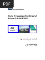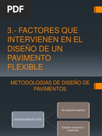Determinacin del efecto de las cargas transmitidas por los diferentes ejes sobre un pavimento flexible Uno de los factores de diseo que presenta mayor variabilidad es el correspondiente al efecto de las cargas que transmiten los vehculos. Cualquier observador, por ms inexperto que sea en el rea de pavimentos, no puede dejar de notar que por una seccin dada de pavimento circulan diariamente un sinnmero de tipos de vehculos, y un mayor nmero de tipos de carga: observar para un mismo tipo de camin que algunos circularn vacos, otros cargados con cemento, otros con cerveza, otros con materiales de construccin, etc.; adems la condicin de variabilidad descrita se repetir para cada tipo de camin sobre la va. Es necesario, en consecuencia, transformar toda esa gama de realidades de formas e intensidades de carga, en un valor que los represente y que sea simplemente obtenible y manejable. Por esta razn se defini un "Eje Patrn" que representa la carga estndar, o normalizada. En Venezuela, como en la gran mayora de los pases occidentales, este "eje patrn" contempla una carga por eje simple de cuatro ruedas de 8.200 kg (80 KN 18.000 libras) Adicionalmente fue necesario asignar a este eje patrn un valor del efecto que causaba al pasar sobre un pavimento, este efecto se conoce como "factor dao", y para una carga patrn de 18 kips, sobre un eje simple de cuatro ruedas (o ruedas morochas), se le asign un valor unitario, es decir cada vez que un eje simple de 18.000 lbs pasa sobre una seccin de un pavimento flexible, causa sobre ese pavimento un dao igual a uno (1). Como consecuencia de esta simplificacin surge la definicin de los "Factores de equivalencia de cargas", que "son valores numricos que definen el dao que causa el paso de un vehculo, o eje determinado, sobre una seccin de pavimento en una manera relativa al dao que el vehculo, o eje patrn, causa al pasar sobre la misma seccin de pavimento", o dicho de otra manera, los "Factores de Equivalencia" transforman las repeticiones de un eje cualquiera, a un nmero de repeticiones del eje patrn que causan el mismo efecto dao sobre el pavimento que el dao causado por ese eje cualquiera. Los "Factores de Equivalencia" para los ejes simples y tandem (dobles y triples) son los derivados empricamente en el Ensayo Vial AASHO en funcin no solo de la magnitud de la carga y la configuracin del eje que la transmite al pavimento, sino tambin del tipo de pavimento (flexible o rgido), del espesor del pavimento y de la condicin final de calidad de rodaje del pavimento para el momento final del periodo de diseo y obedecen, en una forma muy simplificada, a la relacin exponencial siguiente: