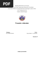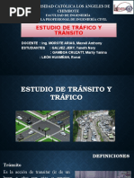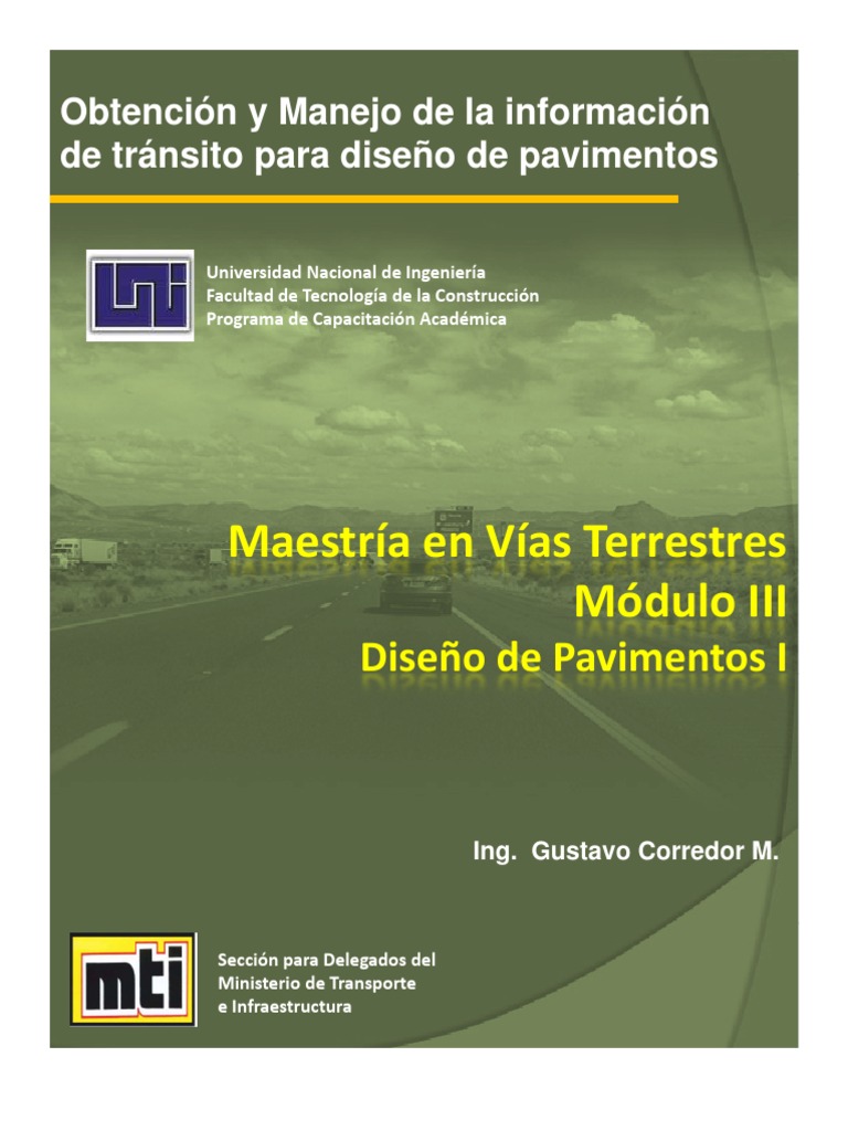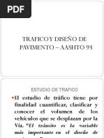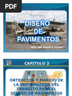 Introduccin El trnsito es la variable ms importante en el diseo de pavimentos. As comienza el Profesor Yang H. Huang, de la Universidad de Kentucky, el Captulo dedicado a este tema en su libro Anlisis y Diseo de Pavimentos 1. En Venezuela deberamos aadir que es tambin la menos estudiada y a la que se le otorga la menor importancia. Para el dimensionamiento de un pavimento es necesario determinar los efectos que las cargas de estos vehculos causarn sobre el pavimento, por lo cual se debe conocer el nmero y tipo de vehculos que circularn por una va, as como la intensidad de la carga y la configuracin del eje que la aplica. El objeto de este captulo es presentar la metodologa para la determinacin de los parmetros de trnsito que se requieren para el diseo estructural de los pavimentos en carreteras y autopistas interurbanas. En el pas los bienes de produccin y consumo se transportan bsicamente por carretera. La Norma COVENIN 614 actualizada en el ao 19972, establece la siguiente reglamentacin en cuanto a cargas mximas: 6.000 kg. en eje simple de 2 cauchos 13.000 kg. en eje simple de 4 cauchos 20.000 kg en dos ejes simples consecutivos de 4 cauchos cada uno 27.000 kg en tres ejes simples consecutivos de 4 cauchos cada uno No existe en Venezuela un control de cargas eficiente; lo dispuesto en la Ley y Reglamentos de Trnsito es "letra muerta", y por ello estas disposiciones son violadas constantemente, lo que ha trado como consecuencia el deterioro prematuro de centenares de kilmetros de vas pavimentadas, causando prdidas apreciables al Patrimonio Nacional. Definiciones y conceptos bsicos A continuacin se presentan una serie de definiciones de trminos referentes a los vehculos y cargas que se sirven de una va, y que sern empleados en los procesos de diseo de pavimentos. Estos trminos han sido tomados de la publicacin "NORVIAL: Vocabulario Vial", la cual fue editada por el Ministerio de Transporte y Comunicaciones en Mayo de 1977. Trnsito (Trfico): Los vehculos de todo tipo, con sus respectivas cargas, considerados aisladamente o en conjunto, mientras utilizan cualquier va. Volumen de Trnsito: Nmero de vehculos que pasan por una seccin dada de un canal o va, durante un perodo determinado