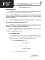 Promedio Diario de Trnsito (PDT o TPDA): volumen promedio de trnsito en veinticuatro (24) horas, obtenido al dividir el volumen total durante un determinado tiempo, generalmente un (1) ao, por el nmero de das del mismo perodo Volumen de trnsito Actual: es aquel que circular por una va si ella estuviera abierta al trnsito. En el caso de vas existentes, donde se cuenta con datos estadsticos, el trnsito actual se puede obtener proyectando para la fecha en consideracin la tendencia de los registros histricos. En el caso de vas que van a ser mejoradas, el trnsito actual estar compuesto por el existente antes de la mejora, ms el trnsito atrado de otras vas cercanas por las ventajas que sta ofrece. En el caso de vas nuevas todo el trnsito ser atrado. Tasa de Crecimiento (TC): Es el incremento anual del volumen de trnsito en una va, expresado en porcentaje. Se determina en base a los datos de las estaciones de conteo, extrapolando la tendencia de los datos estadsticos. Proyeccin de Trnsito: El volumen de trnsito para un ao cualquiera se determina empleando la siguiente ecuacin: