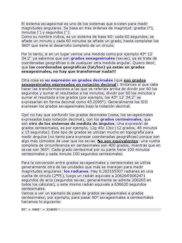 Se basa en tres rdenes de magnitud: grados (), minutos (') y segundos (''). Como su nombre indica, es un sistema de base 60: cada 60 segundos, se aade un minuto y cada 60 minutos se aade un grado, hasta completar los 360 que tiene el desarrollo completo de un crculo. Por lo tanto, si en un lugar vemos una medida como por ejemplo 43 12' 34.2'' ya sabemos que son grados sexagesimales (sexas), ya se trate de coordenadas geogrficas o de cualquier otra medida angular. Quiero decir, que las coordenadas geogrficas (lat/lon) ya estn en grados sexagesimales, no hay que transformar nada!!! Otra cosa es su expresin en grados decimales (que son grados sexagesimales expresados en notacin decimal). Entonces s que cabe hacer las transformaciones a las que os referais arriba de dividir por 60 los segundos y sumar el resultados a los minutos, dividir por 60 los minutos y sumar el resultado a los grados (por ejemplo, los 43 12' 34.2'' se expresaran en forma decimal como 43.2095). Generalmente los SIG expresan los grados sexagesimales bajo la notacin decimal. Ojo! no hay que confundir los grados decimales (osea, los sexagesimales expresados bajo notacin decimal), con los grados centesimales, que son otro de los sistemas de medida de ngulos. Una expresin de grados centesimales, es por ejemplo, 12g 45c 13cc (12 grados, 45 minutos y 13 segundos). Este tipo de grados se utilizan mucho en topografa para medir ngulos (no tanto para expresar coordenadas geogrficas) porque son algo ms cmodos de usar que los sexas. No son equivalentes: una vuelta completa de circunferencia en centesimales son 400 grados, mientras que en sexas son 360. Cada grado centesimal por su parte tiene 100 minutos centesimales y cada minuto 100 segundos centesimales. Para la conversin entre grados sexagesimales y centesimales se utiliza generalmente otra de las unidades que ms se manejan para medir magnitudes angulares: los radianes. Hay 6.283185307 radianes en una vuelta de crculo (2*PI), luego un radin equivale a 206264'8062471 segundos de arco (segundos sexas; generalmente se admite 206265 en todos los clculos), y este mismo radin equivale a 636620 segundos centesimales. Vamos a ver un ejemplo de paso de grados sexagesimales a grados centesimales; por ejemplo, para pasar 90 sexagesimales a centesimales haramos lo siguiente: