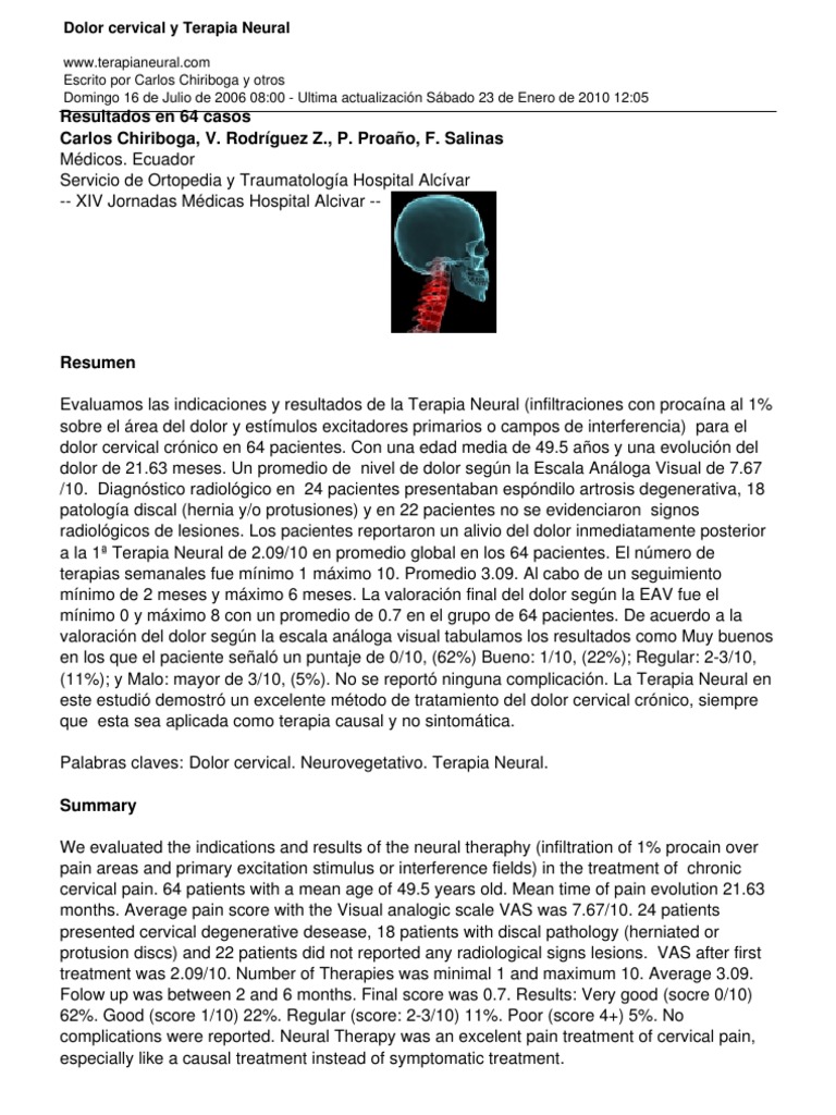 Resumen Evaluamos las indicaciones y resultados de la Terapia Neural (infiltraciones con procana al 1% sobre el rea del dolor y estmulos excitadores primarios o campos de interferencia) para el dolor cervical crnico en 64 pacientes. Con una edad media de 49.5 aos y una evolucin del dolor de 21.63 meses. Un promedio de nivel de dolor segn la Escala Anloga Visual de 7.67 /10. Diagnstico radiolgico en 24 pacientes presentaban espndilo artrosis degenerativa, 18 patologa discal (hernia y/o protusiones) y en 22 pacientes no se evidenciaron signos radiolgicos de lesiones. Los pacientes reportaron un alivio del dolor inmediatamente posterior a la 1 Terapia Neural de 2.09/10 en promedio global en los 64 pacientes. El nmero de terapias semanales fue mnimo 1 mximo 10. Promedio 3.09. Al cabo de un seguimiento mnimo de 2 meses y mximo 6 meses. La valoracin final del dolor segn la EAV fue el mnimo 0 y mximo 8 con un promedio de 0.7 en el grupo de 64 pacientes. De acuerdo a la valoracin del dolor segn la escala anloga visual tabulamos los resultados como Muy buenos en los que el paciente seal un puntaje de 0/10, (62%) Bueno: 1/10, (22%); Regular: 2-3/10, (11%); y Malo: mayor de 3/10, (5%). No se report ninguna complicacin. La Terapia Neural en este estudi demostr un excelente mtodo de tratamiento del dolor cervical crnico, siempre que esta sea aplicada como terapia causal y no sintomtica. Palabras claves: Dolor cervical. Neurovegetativo. Terapia Neural. Summary We evaluated the indications and results of the neural theraphy (infiltration of 1% procain over pain areas and primary excitation stimulus or interference fields) in the treatment of chronic cervical pain. 64 patients with a mean age of 49.5 years old. Mean time of pain evolution 21.63 months. Average pain score with the Visual analogic scale VAS was 7.67/10. 24 patients presented cervical degenerative desease, 18 patients with discal pathology (herniated or protusion discs) and 22 patients did not reported any radiological signs lesions. VAS after first treatment was 2.09/10. Number of Therapies was minimal 1 and maximum 10. Average 3.09. Folow up was between 2 and 6 months. Final score was 0.7. Results: Very good (socre 0/10) 62%. Good (score 1/10) 22%. Regular (score: 2-3/10) 11%. Poor (score 4+) 5%. No complications were reported. Neural Therapy was an excelent pain treatment of cervical pain, especially like a causal treatment instead of symptomatic treatment.