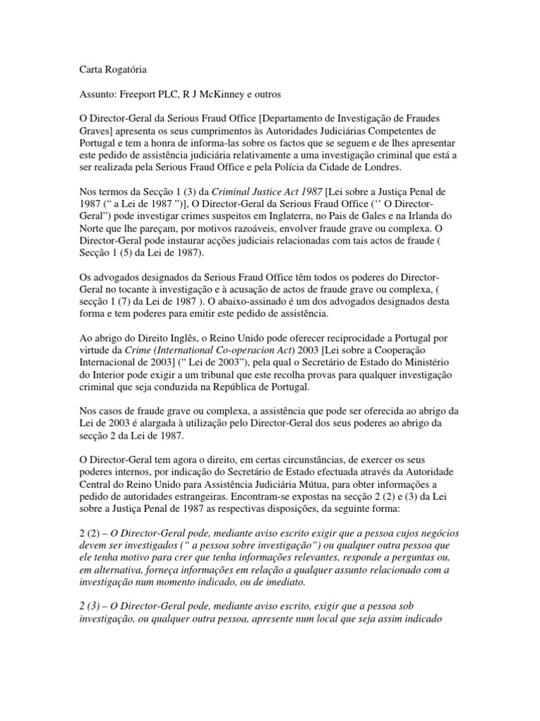 O Director da Serious Fraud Office envia às Autoridades Judiciárias Competentes