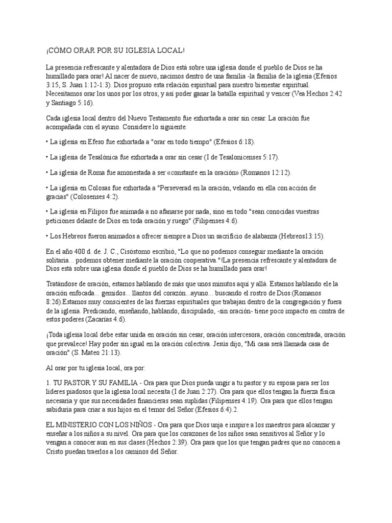 La presencia refrescante y alentadora de Dios est sobre una iglesia donde el pueblo de Dios se ha humillado para orar! Al nacer de nuevo, nacimos dentro de una familia -la familia de la iglesia (Efesios 3:15, S. Juan 1:12-1:3). Dios propuso esta relacin espiritual para nuestro bienestar espiritual. Necesitamos orar los unos por los otros, y as poder ganar la batalla espiritual y vencer (Vea Hechos 2:42 y Santiago 5:16). Cada iglesia local dentro del Nuevo Testamento fue exhortada a orar sin cesar. La oracin fue acompaada con el ayuno. Considere lo siguiente: La iglesia en Efeso fue exhortada a "orar en todo tiempo" (Efesios 6:18). La iglesia de Tesalnica fue exhortada a orar sin cesar (I de Tesalonicenses 5:17). La iglesia de Roma fue amonestada a ser constante en la oracin (Romanos 12:12). La iglesia en Colosas fue exhortada a "Perseverad en la oracin, velando en ella con accin de gracias" (Colosenses 4:2). La iglesia en Filipos fue animada a no afanarse por nada, sino en todo "sean conocidas vuestras peticiones delante de Dios en toda oracin y ruego" (Filipenses 4:6). Los Hebreos fueron animados a ofrecer siempre a Dios un sacrificio de alabanza (Hebreos13:15). En el ao 400 d. de. J. C., Cisstomo escribi, "Lo que no podemos conseguir mediante la oracin solitaria... podemos obtener mediante la oracin cooperativa."!La presencia refrescante y alentadora de Dios est sobre una iglesia donde el pueblo de Dios se ha humillado para orar! Tratndose de oracin, estamos hablando de ms que unos minutos aqu y all. Estamos hablando ele la oracin enfocada... gemidos... llantos del corazn...ayuno... buscando el rostro de Dios (Romanos 8:26).Estamos muy conscientes de las fuerzas espirituales que trabajan dentro de la congregacin y fuera de la iglesia. Predicando, enseando, hablando, discipulado, -sin oracin- tiene poco impacto en contra de estos poderes (Zacaras 4:6). Toda iglesia local debe estar unida en oracin sin cesar, oracin intercesora, oracin concentrada, oracin que prevalece! Hay poder sin igual en la oracin colectiva. Jess dijo, "Mi casa ser llamada casa de oracin" (S. Mateo 21:13). Al orar por tu iglesia local, ora por: 1. TU PASTOR Y SU FAMILIA - Ora para que Dios pueda ungir a tu pastor y su esposa para ser los lderes piadosos que la iglesia local necesita (I de Juan 2:27). Ora para que ellos tengan la fuerza fsica necesaria y que sus necesidades financieras sean suplidas (Filipenses 4:19). Ora para que ellos tengan sabidura para criar a sus hijos en el temor del Seor (Efesios 6:4).2. EL MINISTERIO CON LOS NIOS - Ora para que Dios unja e inspire a los maestros para alcanzar y ensear a los nios a su nivel. Ora para que los corazones de los nios sean sensitivos al Seor y lo vengan a conocer aun en sus clases (Hechos 2:39). Ora para que los que tengan padres que no conocen a Cristo puedan traerlos a los caminos del Seor.
