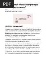 Palabra de poder, Mantra es una palabra de origen snscrito, significa mente y liberacin, de ahi que se dice que un mantra es un instrumento para liberar la mente del flujo constante de pensamientos que la confunden. Un mantra puede ser una slaba, una palabra, una frase o texto largo, que al ser recitado y repetido va llevando a la persona a un estado de profunda concentracin. Antiguos mantras (tales como el Padre Nuestro) y La Gran Invocacin, son efectivos slo si se utilizan en el plano mental y con el poder de una mente controlada enfocada en su intencin y significado detrs del esfuerzo hablado. Entonces se vuelven poderosos. Cuando son pronunciados con el poder del alma, as como con la atencin dirigida de la mente, llegan a ser en forma automtica, dinmicamente efectivos y se cree que producen efectos mgicos, religiosos o espirituales. No basta la repeticin del puro sonido sino que es necesario concentrarse en su significado, as, el mantra nos llevar de las cadenas de la ilusin a la libertad de la sabidura. El mantra, sonido sagrado, debe vibrar no solo en el aire sino en la mente para que el pensamiento y el sonido sean uno. Recitar un mantra tiene un efecto similar al del diapasn que hace vibrar las cuerdas de una guitarra. Pronunciando las slabas de un mantra hacemos vibrar nuestras propias energas internas. Muchos meditadores saben por experiencia que el acto de recitar mantras transciende los sonidos y palabras externas. Es ms bien un escuchar el sonido interior que siempre ha morado en nosotros.