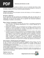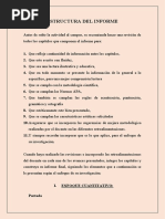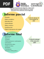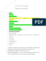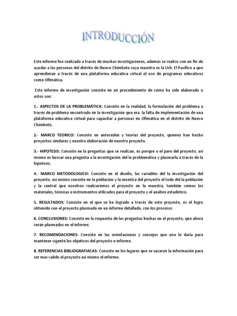 distrito de Nuevo Chimbote cuya muestra es la Urb. El Pacifico a que aprendieran a travs de una plataforma educativa virtual el uso de programas educativos como Ofimtica. Este informe de investigacin consiste en un procedimiento de cmo ha sido elaborado u estos son: 1.- ASPECTOS DE LA PROBLEMTICA: Consiste en la realidad, la formulacin del problema a travs de problema encontrado en la investigacin que era la falta de implementacin de una plataforma educativa virtual para capacitar a personas en Ofimtica en el distrito de Nuevo Chimbote. 2.- MARCO TEORICO: Consiste en anteceden y teoras del proyecto, quienes han hecho proyectos similares y nuestra elaboracin de nuestro proyecto. 3.- HIPOTESIS: Consiste en la preguntas que se realizan, es porque o el pare del proyecto, as mismo es buscar una pregunta a la investigacin del la problemtica y plasmarla a travs de la hipotesis. 4.- MARCO METODOLOGICO: Consiste en el diseo, las variables del la investigacin del proyecto, as mismo consiste en la poblacin y la muestra del proyecto el todo del la poblacin y la central que nosotros realizaremos el proyecto en la muestra, tambin vemos los materiales, tcnicas e instrumentos utilizados para el proyecto y el anlisis estadstico. 5. RESULTADOS: Consiste en el que se ha logrado a travs de este proyecto, es el logro obtenido con el proyecto plasmado en un informe detallado, con los procesos 6. CONCLUSIONES: Consiste en la respuesta de las preguntas hechas en el proyecto, que ahora sern plasmados en el informe. 7. RECOMENDACIONES: Consiste en las orientaciones y consejos que uno le dara para mantener vigente los objetivos del proyecto e informe. 8. REFERENCIAS BIBLIOGRAFIACAS: Consiste en los lugares que se sacaron la informacin para ser mas valido el proyecto as mismo el informe.