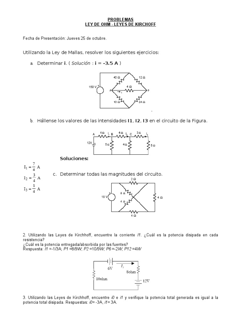 PROBLEMAS LEY DE OHM - LEYES DE KIRCHOFF Fecha de Presentacin: Jueves 25 de octubre.