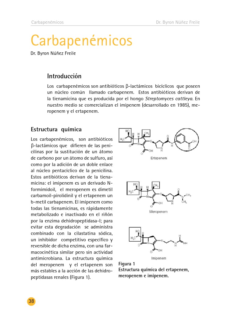 Los carbapenmicos, son antibiticos b-lactmicos que difieren de las penicilinas por la sustitucin de un tomo de carbono por un tomo de sulfuro, as como por la adicin de un doble enlace al ncleo pentacclico de la penicilina. Estos antibiticos derivan de la tienamicina: el imipenem es un derivado Nformimidoil, el meropenem es dimetil carbamoil-pirolidinil y el ertapenem un b-metil carbapenem. El imipenem como todas las tienamicinas, es rpidamente metabolizado e inactivado en el rin por la enzima dehidropeptidasa-I; para evitar esta degradacin se administra combinado con la cilastatina sdica, un inhibidor competitivo especfico y reversible de dicha enzima, con una farmacocintica similar pero sin actividad antimicrobiana. La estructura qumica del meropenem y el ertapenem son ms estables a la accin de las dehidropeptidasas renales (Figura 1).