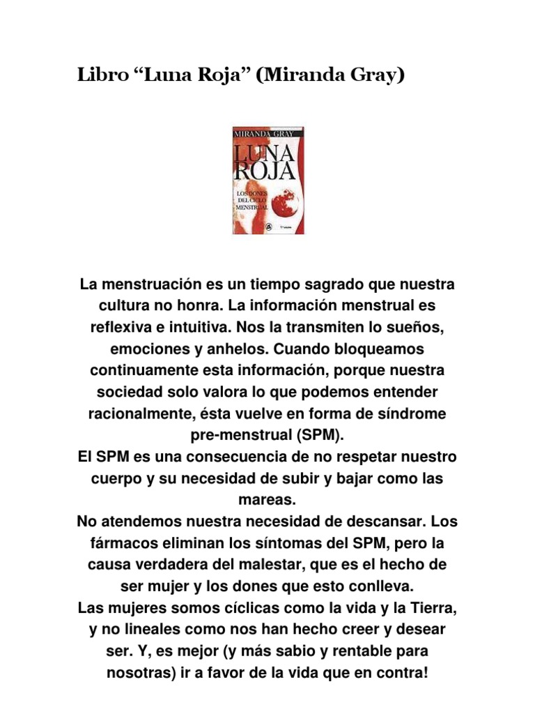 La menstruacin es un tiempo sagrado que nuestra cultura no honra. La informacin menstrual es reflexiva e intuitiva. Nos la transmiten lo sueos, emociones y anhelos. Cuando bloqueamos continuamente esta informacin, porque nuestra sociedad solo valora lo que podemos entender racionalmente, sta vuelve en forma de sndrome pre-menstrual (SPM). El SPM es una consecuencia de no respetar nuestro cuerpo y su necesidad de subir y bajar como las mareas. No atendemos nuestra necesidad de descansar. Los frmacos eliminan los sntomas del SPM, pero la causa verdadera del malestar, que es el hecho de ser mujer y los dones que esto conlleva. Las mujeres somos cclicas como la vida y la Tierra, y no lineales como nos han hecho creer y desear ser. Y, es mejor (y ms sabio y rentable para nosotras) ir a favor de la vida que en contra!