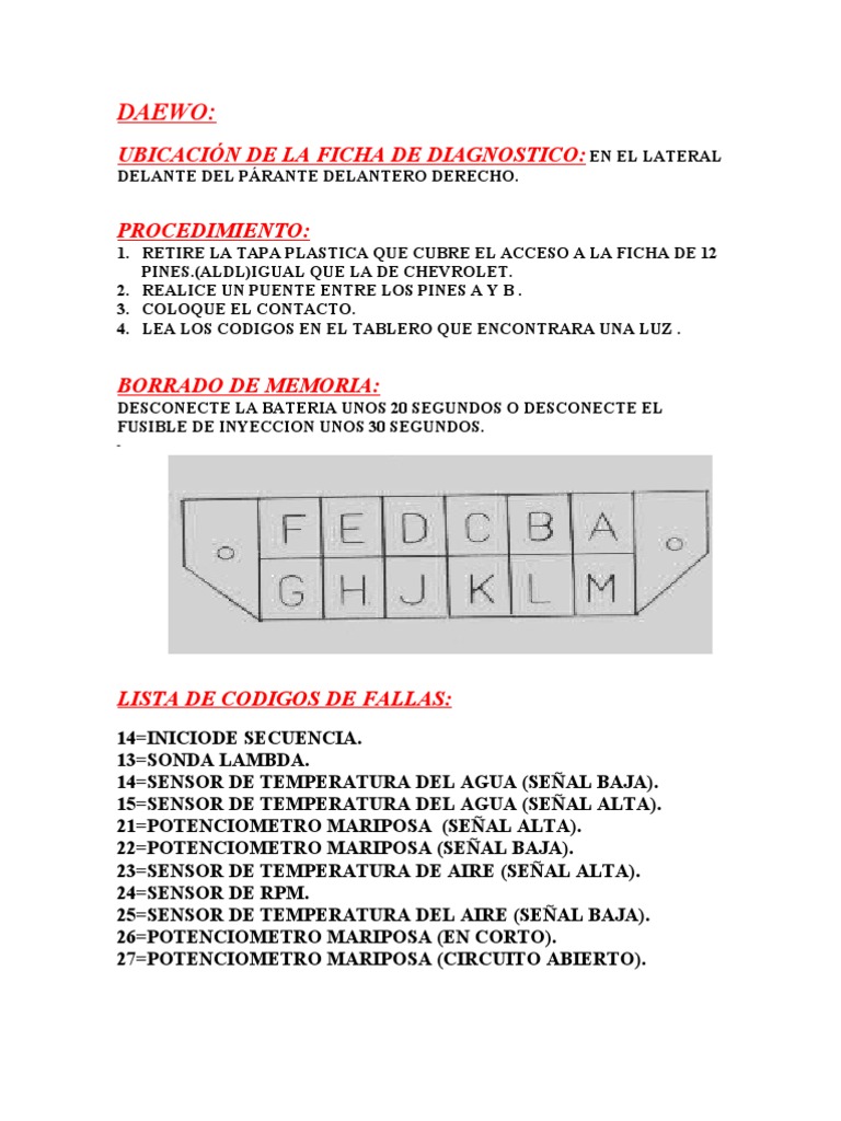 1. RETIRE LA TAPA PLASTICA QUE CUBRE EL ACCESO A LA FICHA DE 12 PINES.(ALDL)IGUAL QUE LA DE CHEVROLET. 2. REALICE UN PUENTE ENTRE LOS PINES A Y B . 3. COLOQUE EL CONTACTO. 4. LEA LOS CODIGOS EN EL TABLERO QUE ENCONTRARA UNA LUZ .